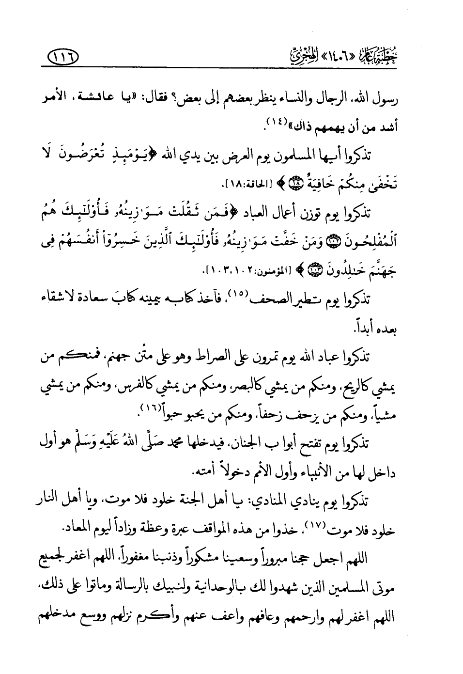تذكروا يوم ينادي المنادي: يا أهل الجنة خلود فلا موت، ويا أهل النار خلود فلا موت خذوا من هذه المواقف عبرة وعظة وازديادا ليوم الميعاد.