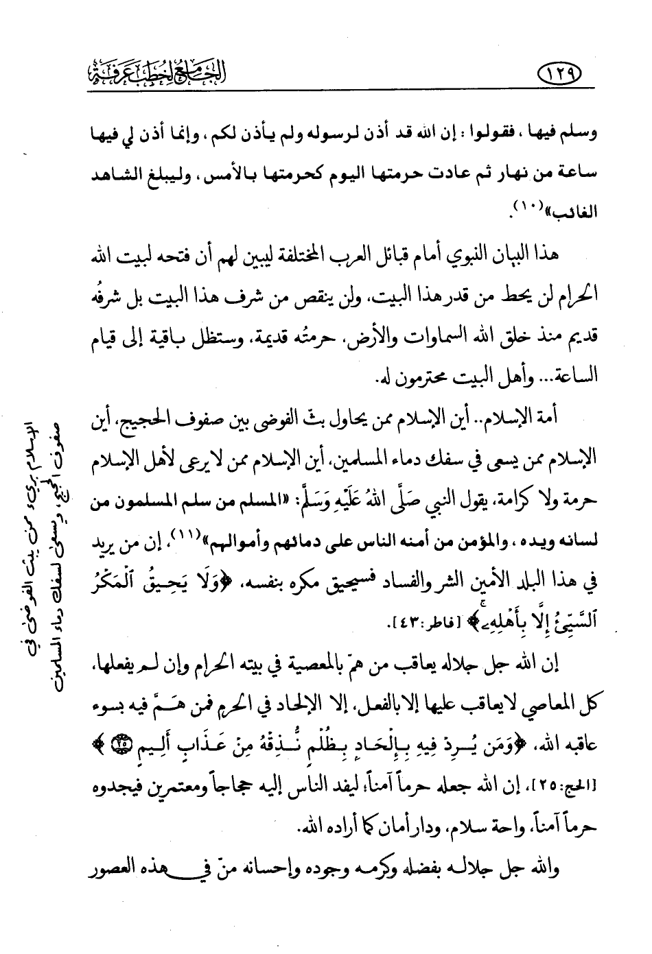 أمة الإسلام، أين الإسلام ممن يحاول بث الفوضى بين صفوف الحجيج، أين الإسلام ممن يسعى في سفك دماء المسلمين، أين الإسلام ممن لا يرعى لأهل الإسلام حرمة ولا كرامة، يقول النبي -صلى الله عليه وسلم-: «المسلم من سلم المسلمون من لسانه ويده، والمؤمن من أمنه الناس على دمائهم وأموالهم (¬1) » إن من يريد في هذا البلد الأمين الشر والفساد فسيحيق مكره بنفسه، {وَلَا يَحِيقُ الْمَكْرُ السَّيِّئُ إِلَّا بِأَهْلِهِ} (¬2) .