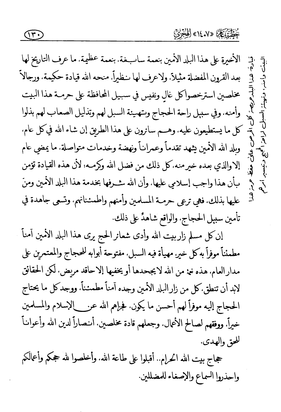 الأخيرة على هذا البلد الأمين بنعمة سابغة، بنعمة عظيمة، ما عرف التاريخ لها بعد القرون المفضلة مثيلا، ولا عرف لها نظيرا، منحه الله قيادة حكيمة، ورجالا مخلصين، استرخصوا كل غال ونفيس في سبيل المحافظة على حرمة هذا البيت وأمنه، وفي سبيل راحة الحجاج وتهيئة السبل لهم، وتذليل الصعاب لهم، بذلوا كل ما يستطيعون عليه، وهم سائرون على هذا الطريق إن شاء الله في كل عام، وبلد الله الأمين يشهد تقدما وعمرانا ونهضة وخدمات متواصلة، ما يمضي عام إلا والذي بعده خير منه، كل ذلك من فضل الله وكرمه؛ لأن هذه القيادة تؤمن بأن هذا واجب إسلامي عليها، وأن الله شرفها بخدمة هذا البلد الأمين ومن عليها بذلك، فهي ترعى حرمة المسلمين وأمنهم واطمئنانهم، وتسعى جاهدة في تأمين سبيل الحجاج، والواقع شاهد على ذلك.