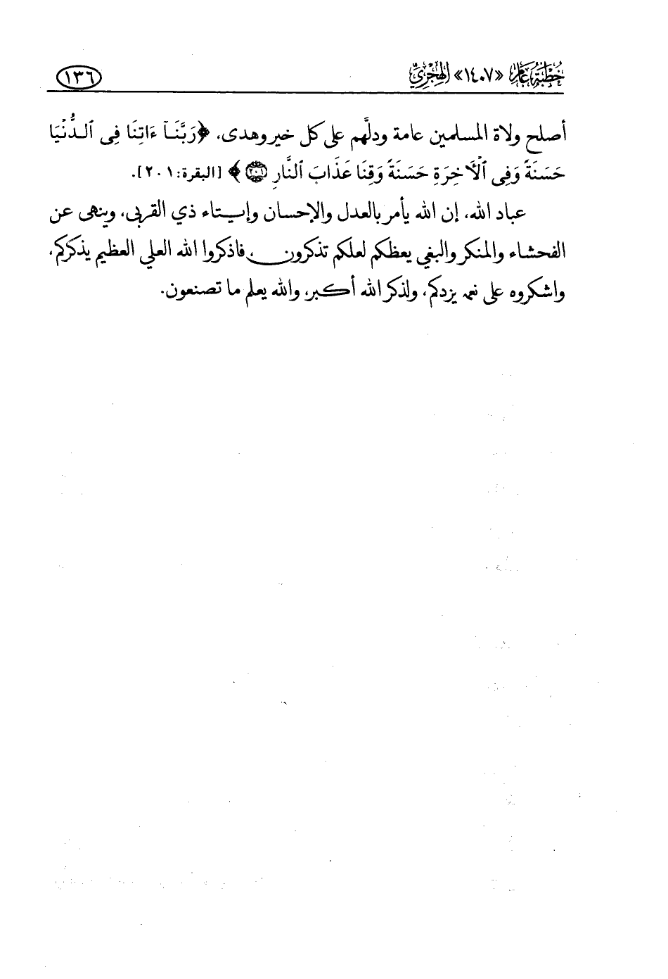 عباد الله، إن الله يأمر بالعدل والإحسان وإيتاء ذي القربى، وينهى عن الفحشاء والمنكر والبغي، يعظكم لعلكم تذكرون، فاذكروا الله العلي العظيم يذكركم، واشكروه على نعمه يزدكم، ولذكر الله أكبر، والله يعلم ما تصنعون.