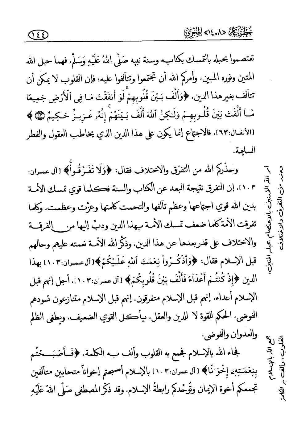 تعتصموا بحبله بالتمسك بكتابه وسنة نبيه -صلى الله عليه وسلم-، فهما حبل الله المتين ونوره المبين، وأمركم الله أن تجتمعوا وتتآلفوا عليه، فإن القلوب لا يمكن أن تتآلف بغير هذا الدين {وَأَلَّفَ بَيْنَ قُلُوبِهِمْ لَوْ أَنْفَقْتَ مَا فِي الْأَرْضِ جَمِيعًا مَا أَلَّفْتَ بَيْنَ قُلُوبِهِمْ وَلَكِنَّ اللَّهَ أَلَّفَ بَيْنَهُمْ إِنَّهُ عَزِيزٌ حَكِيمٌ} (¬1) ، فالاجتماع إنما يكون على هذا الدين الذي يخاطب العقول والفطرة السليمة.