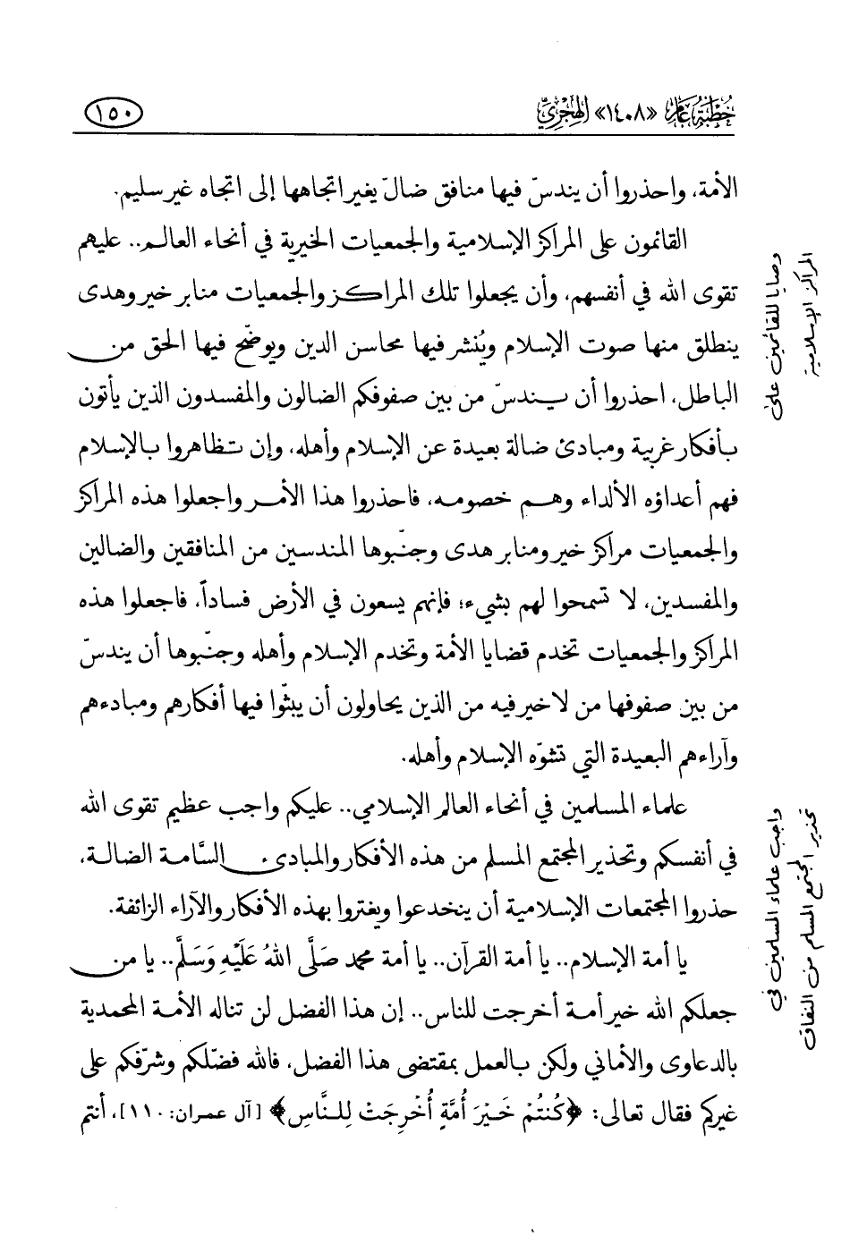 القائمون على المراكز الإسلامية والجمعيات الخيرية في أنحاء العالم، عليهم تقوى الله في أنفسهم، وأن يجعلوا تلك المراكز والجمعيات منابر خير وهدى، ينطلق منها صوت الإسلام وينشر فيها محاسن الدين، ويوضح فيها الحق من الباطل، احذروا أن يندس من بين صفوفكم الضالون والمفسدون، الذين يأتون بأفكار غربية ومبادئ ضالة بعيدة عن الإسلام وأهله، وإن تظاهروا بالإسلام فهم أعداؤه الألداء وهم خصومه، فاحذروا هذا الأمر واجعلوا هذه المراكز والجمعيات مراكز خير ومنابر هدى، وجنبوها المندسين من المنافقين والضالين والمفسدين، لا تسمحوا لهم بشيء؛ فإنهم يسعون في الأرض فسادا، فاجعلوا هذه المراكز والجمعيات تخدم قضايا الأمة وتخدم الإسلام وأهله، وجنبوها أن يندس من بين صفوفها من لا خير فيه من الذين يحاولون أن يبثوا فيها أفكارهم ومبادءهم وآراءهم البعيدة التي تشوه الإسلام وأهله.
