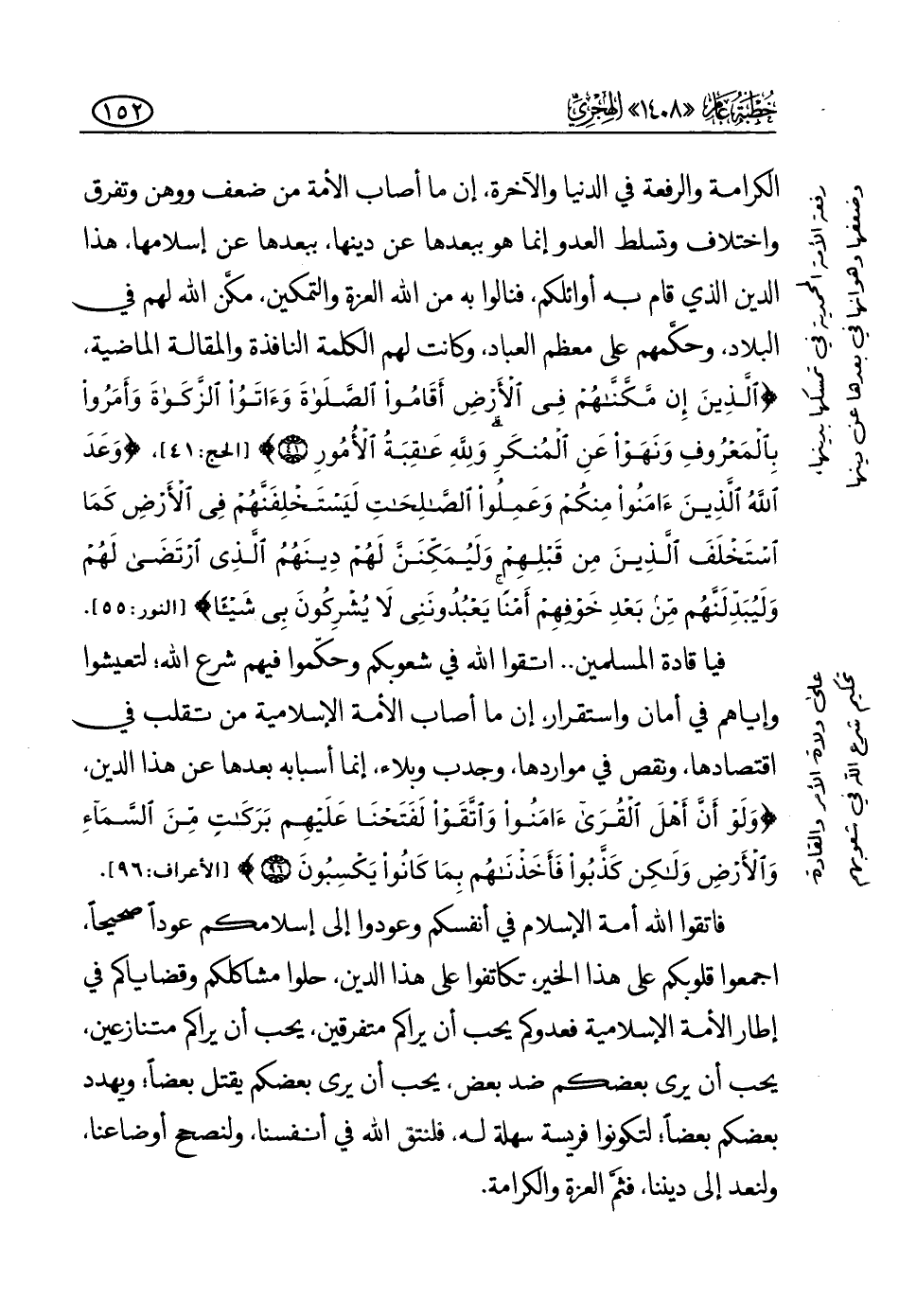 الكرامة والرفعة في الدنيا والآخرة، إن ما أصاب الأمة من ضعف ووهن وتفرق واختلاف وتسلط العدو إنما هو ببعدها عن دينها، ببعدها عن إسلامها، هذا الدين الذي قام به أوائلكم، فنالوا به من الله العزة والتمكين، مكن الله لهم في البلاد، وحكمهم على معظم العباد، وكانت لهم الكلمة النافذة والمقالة الماضية، {الَّذِينَ إِنْ مَكَّنَّاهُمْ فِي الْأَرْضِ أَقَامُوا الصَّلَاةَ وَآتَوُا الزَّكَاةَ وَأَمَرُوا بِالْمَعْرُوفِ وَنَهَوْا عَنِ الْمُنْكَرِ وَلِلَّهِ عَاقِبَةُ الْأُمُورِ} (¬1) ، {وَعَدَ اللَّهُ الَّذِينَ آمَنُوا مِنْكُمْ وَعَمِلُوا الصَّالِحَاتِ لَيَسْتَخْلِفَنَّهُمْ فِي الْأَرْضِ كَمَا اسْتَخْلَفَ الَّذِينَ مِنْ قَبْلِهِمْ وَلَيُمَكِّنَنَّ لَهُمْ دِينَهُمُ الَّذِي ارْتَضَى لَهُمْ وَلَيُبَدِّلَنَّهُمْ مِنْ بَعْدِ خَوْفِهِمْ أَمْنًا يَعْبُدُونَنِي لَا يُشْرِكُونَ بِي شَيْئًا} (¬2)