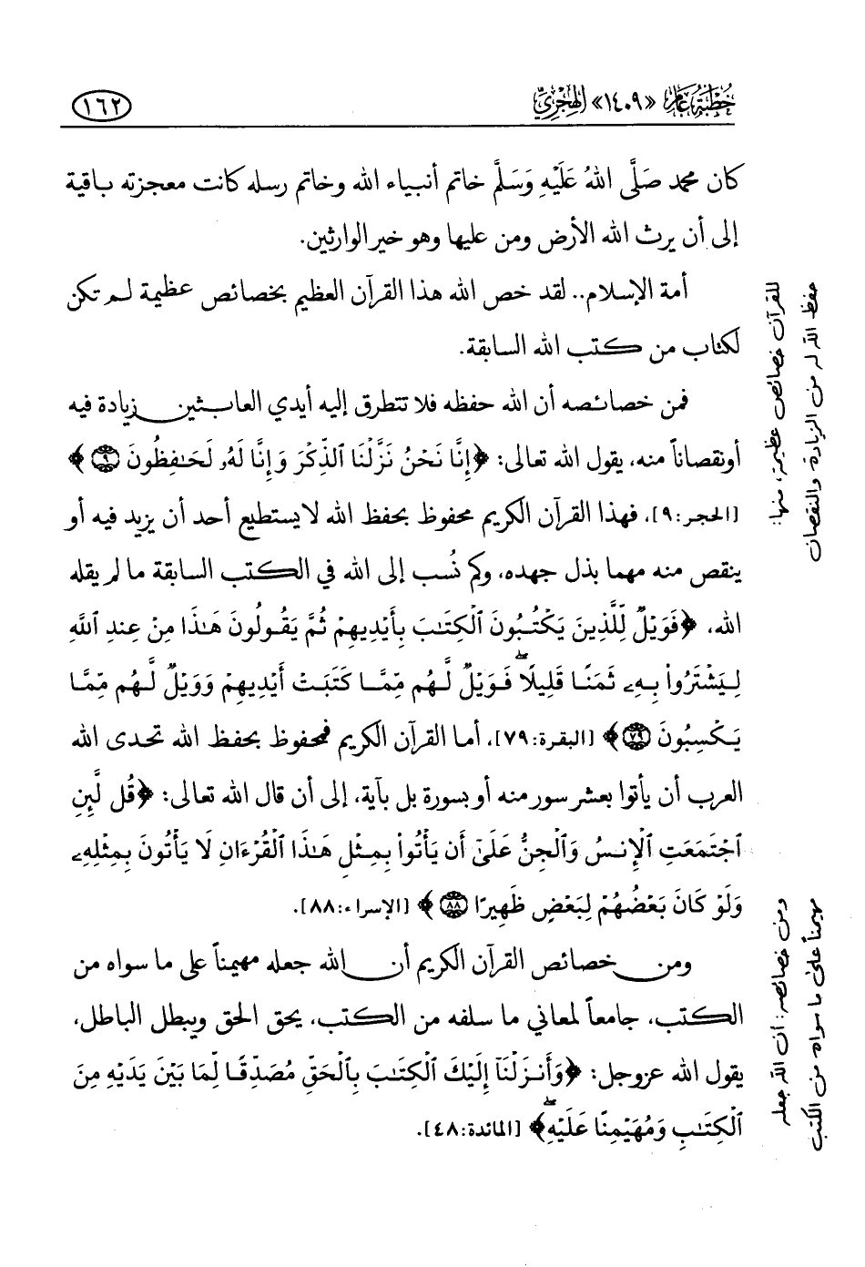 “ للقرآن خصائص عظيمة منها: حفظ الله له من الزيادة والنقصان “