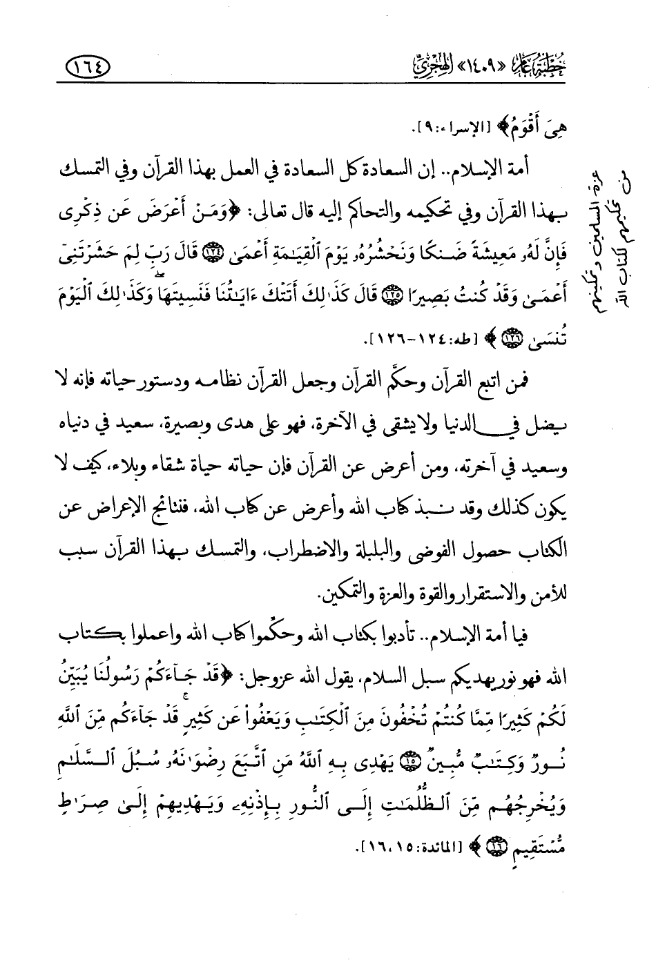 أمة الإسلام، إن السعادة كل السعادة في العمل بهذا القرآن، وفي التمسك بهذا القرآن، وفي تحكيمه والتحاكم إليه، قال تعالى: {وَمَنْ أَعْرَضَ عَنْ ذِكْرِي فَإِنَّ لَهُ مَعِيشَةً ضَنْكًا وَنَحْشُرُهُ يَوْمَ الْقِيَامَةِ أَعْمَى} (¬1) {قَالَ رَبِّ لِمَ حَشَرْتَنِي أَعْمَى وَقَدْ كُنْتُ بَصِيرًا} (¬2) {قَالَ كَذَلِكَ أَتَتْكَ آيَاتُنَا فَنَسِيتَهَا وَكَذَلِكَ الْيَوْمَ تُنْسَى} (¬3) .