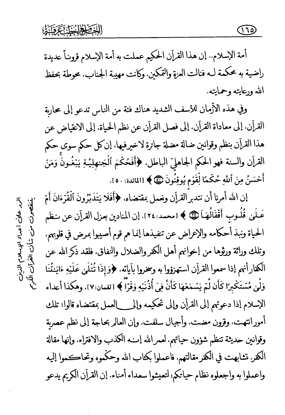 وفي هذه الأزمان -للأسف الشديد- هناك فئة من الناس تدعو إلى محاربة القرآن، إلى معاداة القرآن، إلى فصل القرآن عن نظم الحياة، إلى الاعتياض عن هذا القرآن بنظم وقوانين ضالة مضلة جائرة لا خير فيها، إن كل حكم سوى حكم القرآن والسنة، فهو الحكم الجاهلي الباطل، {أَفَحُكْمَ الْجَاهِلِيَّةِ يَبْغُونَ وَمَنْ أَحْسَنُ مِنَ اللَّهِ حُكْمًا لِقَوْمٍ يُوقِنُونَ} (¬1) .