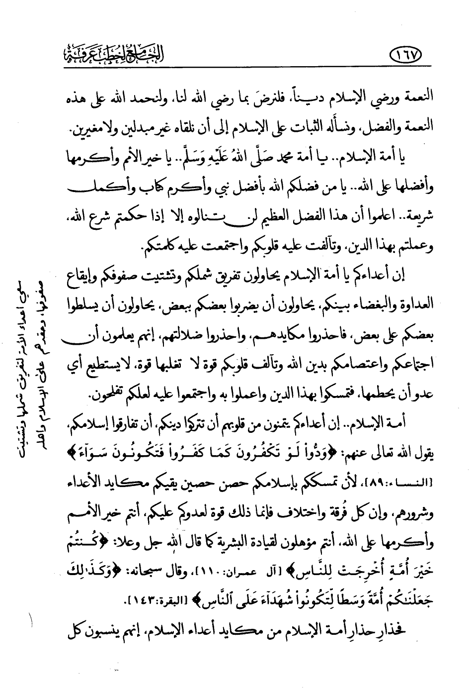 إن أعداءكم يا أمة الإسلام يحاولون تفريق شملكم وتشتيت صفوفكم، وإيقاع العداوة والبغضاء بينكم، يحاولون أن يضربوا بعضكم ببعض، يحاولون أن يسلطوا بعضكم على بعض، فاحذروا مكايدهم، واحذروا ضلالاتهم، إنهم يعلمون أن اجتماعكم واعتصامكم بدين الله وتآلف قلوبكم قوة لا تغلبها قوة، لا يستطيع أي عدو أن يحطمها، فتمسكوا بهذا الدين واعملوا به واجتمعوا عليه لعلكم تفلحون.