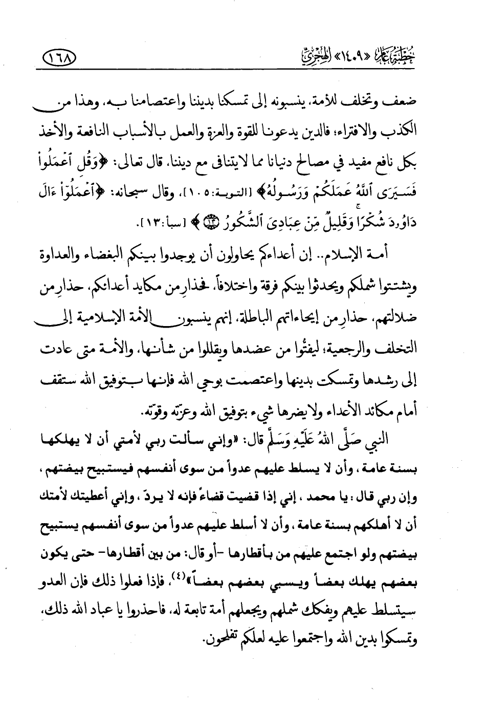 النبي -صلى الله عليه وسلم- قال: «وإني سألت ربي لأمتي أن لا يهلكها بسنة عامة، وأن لا يسلط عليهم عدوا من سوى أنفسهم فيستبيح بيضتهم، وإن ربي قال: يا محمد، إني إذا قضيت قضاء فإنه لا يرد، وإني أعطيتك لأمتك أن لا أهلكهم بسنة عامة، وأن لا أسلط عليهم عدوا من سوى أنفسهم يستبيح بيضتهم ولو اجتمع عليهم من بأقطارها - أو قال: من بين أقطارها - حتى يكون بعضهم يهلك بعضا، ويسبي بعضهم بعضا (¬3) » فإذا فعلوا ذلك فإن العدو سيسلط عليهم ويفكك شملهم، ويجعلهم أمة تابعة له، فاحذروا يا عباد الله ذلك، وتمسكوا بدين الله واجتمعوا عليه لعلكم تفلحون.