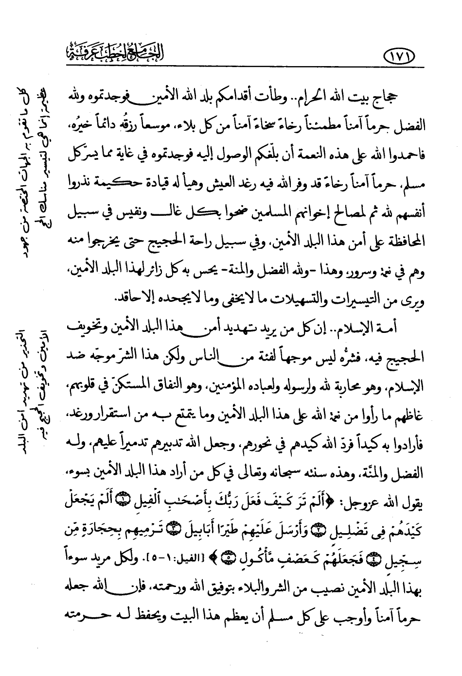 أمة الإسلام، إن كل من يريد تهديد أمن هذا البلد الأمين وتخويف الحجيج فيها، فشره ليس موجها لفئة من الناس، ولكن هذا الشر موجه ضد الإسلام، وهو محاربة لله ولرسوله ولعباده المؤمنين، وهو النفاق المستكن في قلوبهم، غاظهم ما رأوا من نعم الله على هذا البلد الأمين وما يتمتع به من استقرار ورغد، فأرادوا به كيدا فرد الله كيدهم في نحورهم، وجعل الله تدبيرهم تدميرا عليهم، وله الفضل والمنة، وهذه سنته -سبحانه وتعالى- في كل من أراد هذا البلد الأمين بسوء، يقول الله -عز وجل-: {أَلَمْ تَرَ كَيْفَ فَعَلَ رَبُّكَ بِأَصْحَابِ الْفِيلِ} (¬1) {أَلَمْ يَجْعَلْ كَيْدَهُمْ فِي تَضْلِيلٍ} (¬2) {وَأَرْسَلَ عَلَيْهِمْ طَيْرًا أَبَابِيلَ} (¬3) {تَرْمِيهِمْ بِحِجَارَةٍ مِنْ سِجِّيلٍ} (¬4) {فَجَعَلَهُمْ كَعَصْفٍ مَأْكُولٍ} (¬5) ، ولكل مريد سوءا بهذا البلد الأمين نصيب من الشر والبلاء بتوفيق الله ورحمته، فإن الله جعلها حرما آمنا، وواجب على كل مسلم أن يعظم هذا البيت ويحفظ له حرمته