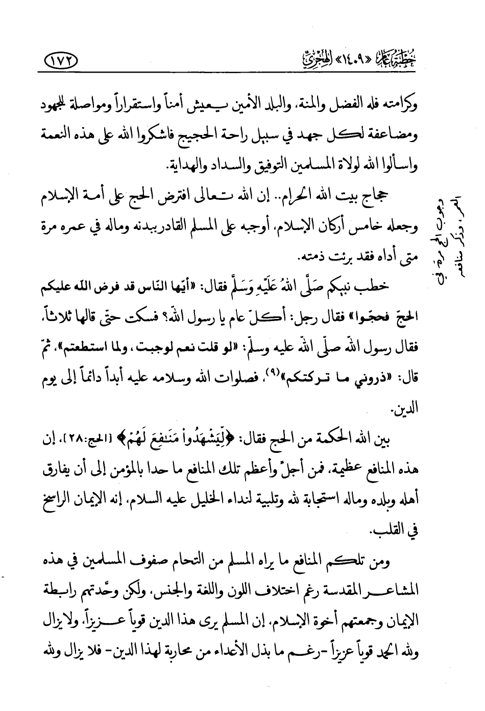 حجاج بيت الله الحرام، إن الله افترض الحج على أمة الإسلام وجعلها خامس أركان الإسلام، أوجبها على المسلم القادر ببدنه وماله في عمره مرة، متى أداه فقد برئت ذمته.