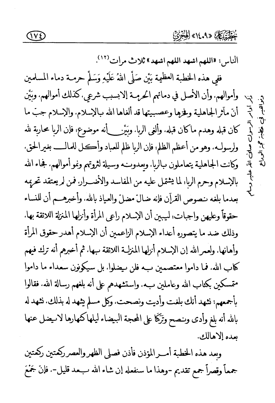 ففي هذه الخطبة العظيمة بين -صلى الله عليه وسلم- حرمة دماء المسلمين وأموالهم، وأن الأصل في دمائهم الحرمة إلا بسبب شرعي، كذلك أموالهم، وبين أن مآثر الجاهلية وفخرها وعصبيتها قد ألغاها بالإسلام، والإسلام جب ما كان قبله وهدم ما كان قبله، وألغى الربا وبين أنه موضوع، فإن الربا محاربة لله ولرسوله، وهو من أعظم الظلم، فإن الربا ظلم للعباد وأكل للمال بغير الحق، وكانت الجاهلية يتعاملون بالربا، ويعدونه وسيلة لثروتهم ونمو أموالهم، فجاء الله بالإسلام وحرم الربا؛ لما يشتمل عليه من المفاسد والأضرار، فمن لم يعتقد تحريمه بعدما بلغه نصوص القرآن، فإنه ضال مضل والعياذ بالله، وأخبرهم أن للنساء حقوقا وعليهن واجبات، ليبين أن الإسلام راعى المرأة وأنزلها المنزلة اللائقة بها، وذلك ضد ما يتصوره أعداء الإسلام الزاعمين أن الإسلام أهدر حقوق المرأة وأهانها، ولعمر الله إن الإسلام أنزلها المنزلة اللائقة بها، ثم أخبرهم، أنه ترك فيهم كتاب الله، فما داموا معتصمون به فلن يضلوا، بل سيكونون سعداء ما داموا متمسكين بكتاب الله وعاملين به، واستشهدهم على أنه بلغهم رسالة الله، فقالوا بأجمعهم: نشهد أنك بلغت وأديت ونصحت، وكل مسلم يشهد لك بذلك، نشهد له بالله أنه بلغ وأدى ونصح وتركنا على المحجة البيضاء، ليلها كنهارها لا يضل عنها بعده إلا هالك.