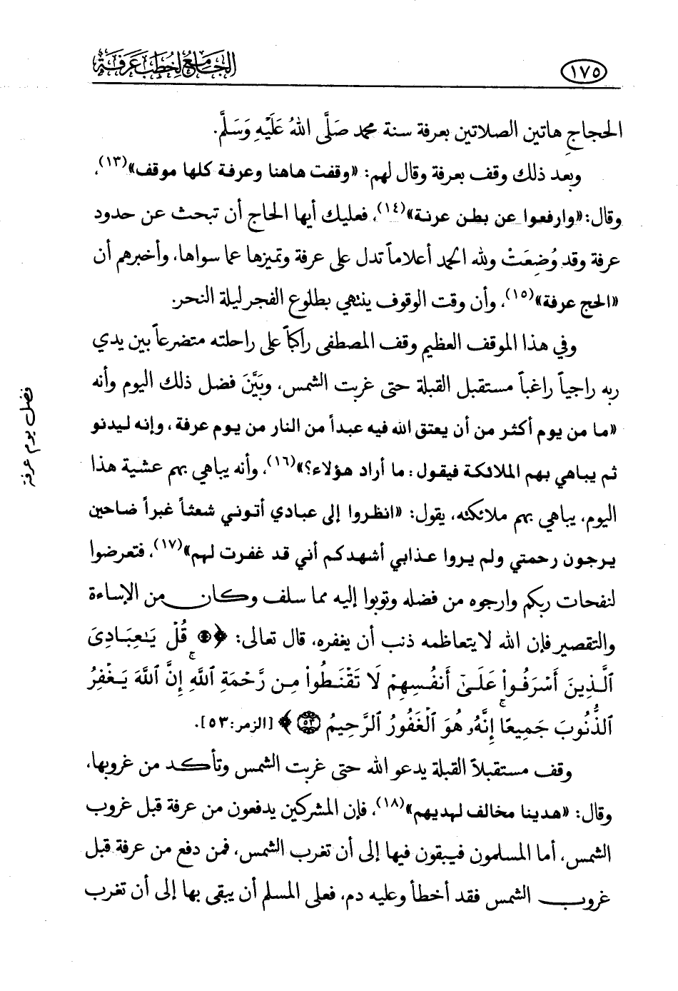 وبعد ذلك «وقف بعرفة وقال لهم: " وقفت هاهنا وعرفة كلها موقف (¬1) » وقال: «وارفعوا عن بطن عرنة (¬2) » عليك أيها الحاج أن تبحث عن حدود عرفة، وقد وضعت ولله الحمد أعلاما تدل على عرفة وتميزها عما سواها، وأخبرهم أن «الحج عرفة (¬3) » وأن وقت الوقوف ينتهي بطلوع الفجر ليلة النحر.