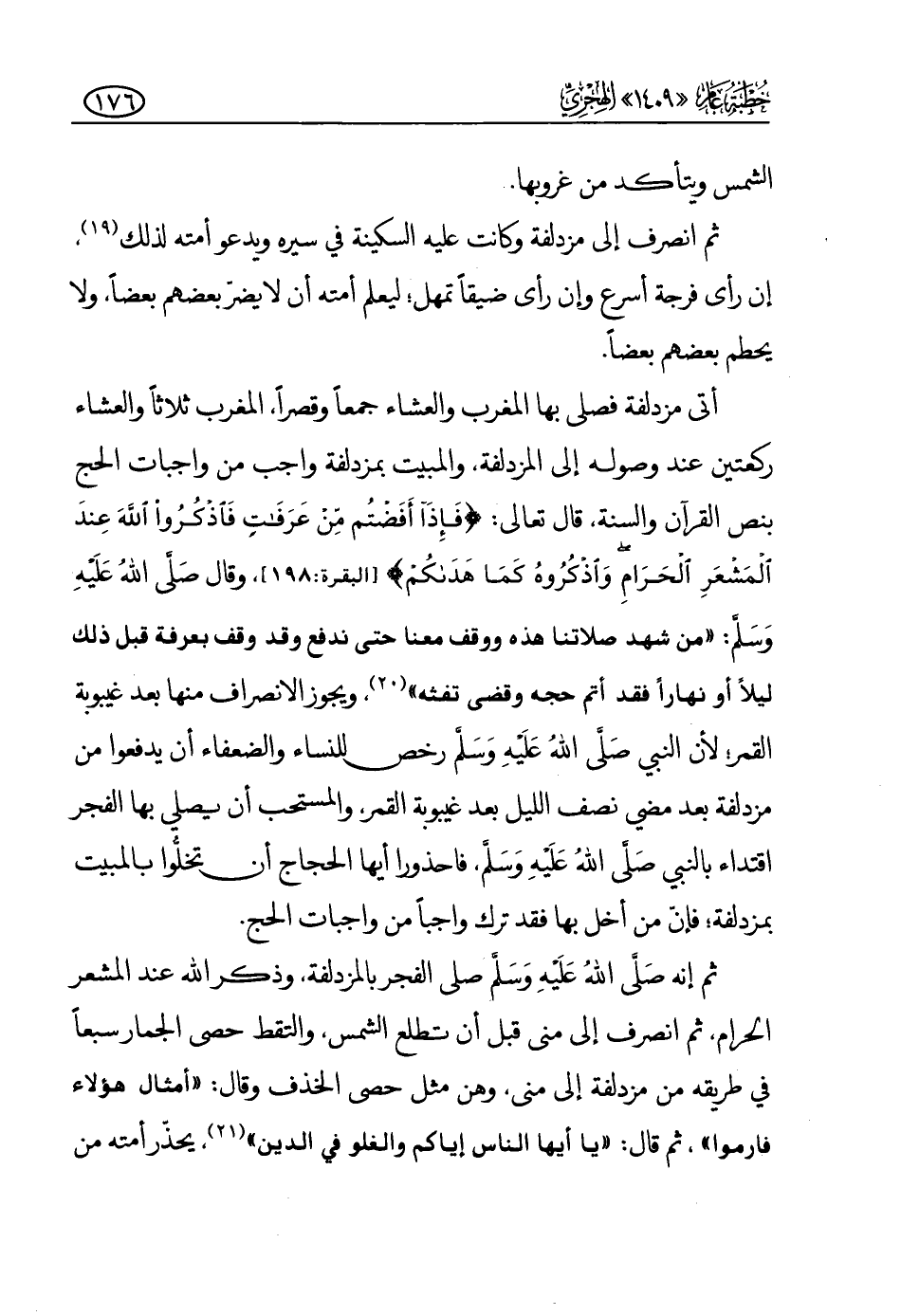 ثم انصرف إلى مزدلفة، وكانت عليه السكينة في سيره، ويدعو أمته لذلك إن رأى فرجة أسرع، وإن رأى ضيقا تمهل، ليعلم أمته أن لا يضر بعضهم بعضا، ولا يحطم بعضهم بعضا.