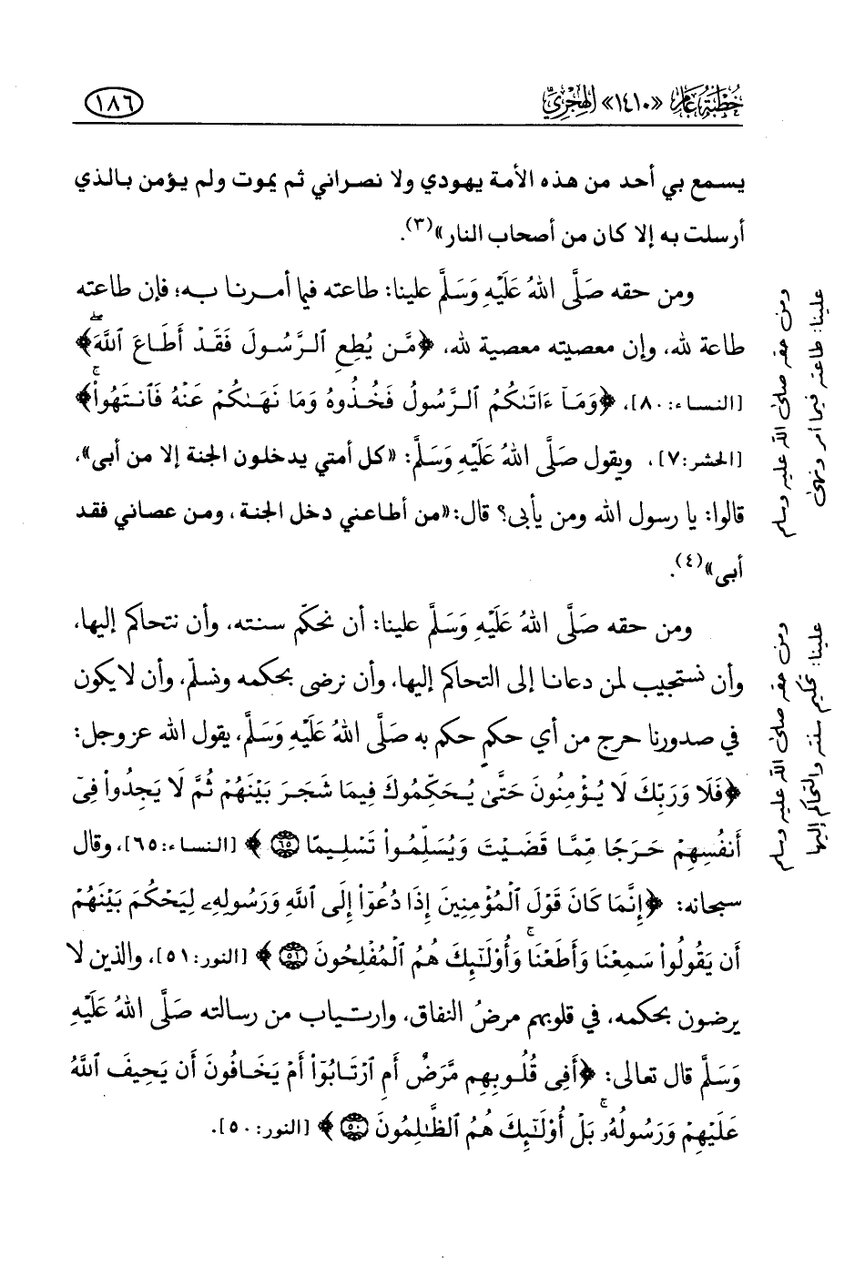 “ ومن حقه -صلى الله عليه وسلم- علينا: طاعته فيما أمر ونهى “