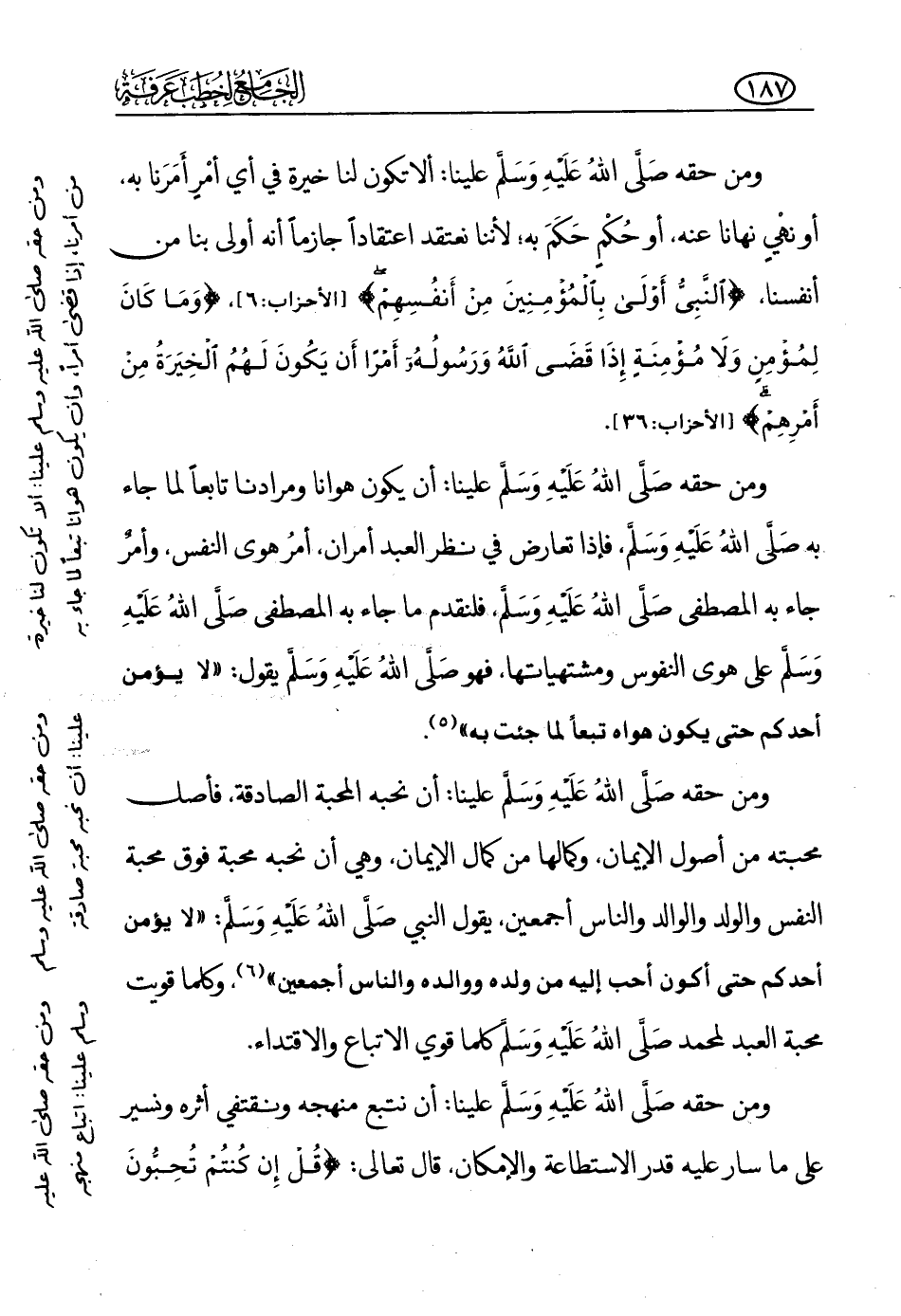 ومن حقه -صلى الله عليه وسلم- علينا: أن يكون هوانا ومرادنا تبعا لما جاء به -صلى الله عليه وسلم-، فإذا تعارض في نظر العبد أمران: أمر هوى النفس، وأمر جاء به المصطفى -صلى الله عليه وسلم-، فلنقدم ما جاء به المصطفى -صلى الله عليه وسلم- على هوى النفوس ومشتهياتها، فهو -صلى الله عليه وسلم- يقول: «لا يؤمن أحدكم حتى يكون هواه تبعا لما جئت به (¬3) »
