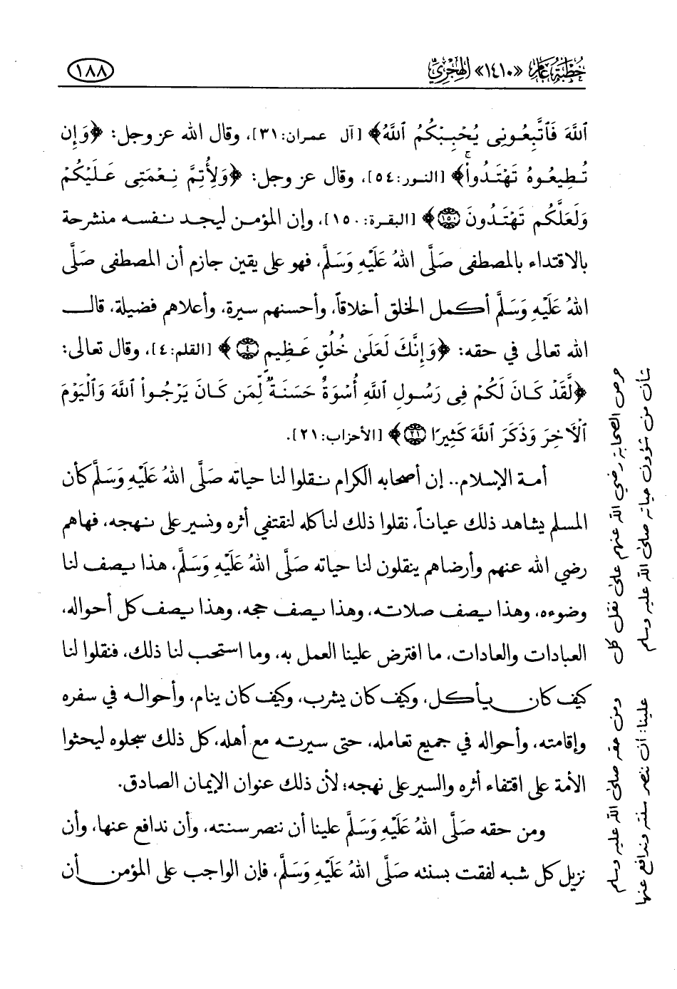 وقال -عز وجل-: {وَإِنْ تُطِيعُوهُ تَهْتَدُوا} (¬1) ، وقال -عز وجل-: {وَلِأُتِمَّ نِعْمَتِي عَلَيْكُمْ وَلَعَلَّكُمْ تَهْتَدُونَ} (¬2) ، وإن المؤمن ليجد نفسه منشرحا بالاقتداء بالمصطفى -صلى الله عليه وسلم-، فهو على يقين جازم أن المصطفى -صلى الله عليه وسلم- أكمل الخلق أخلاقا وأحسنهم سيرة، وأعلاهم فضيلة، قال الله تعالى في حقه: {وَإِنَّكَ لَعَلى خُلُقٍ عَظِيمٍ} (¬3) ، وقال تعالى: {لَقَدْ كَانَ لَكُمْ فِي رَسُولِ اللَّهِ أُسْوَةٌ حَسَنَةٌ لِمَنْ كَانَ يَرْجُو اللَّهَ وَالْيَوْمَ الْآخِرَ وَذَكَرَ اللَّهَ كَثِيرًا} (¬4) .