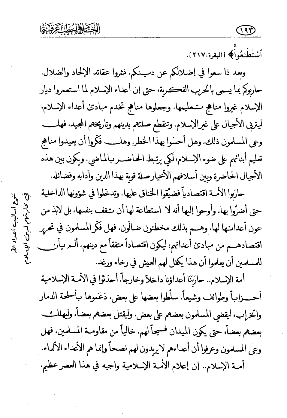 وبعد ذلك سعوا في إضلالكم عن دينكم، نشروا عقائد الإلحاد والضلال، حاربوكم بما يسمى بالحرب الفكرية، حتى إن أعداء الإسلام لما استعمروا ديار الإسلام غيروا مناهج تعليمها، وجعلوها مناهج تخدم مبادئ أعداء الإسلام، ليتربى الأجيال على غير الإسلام، وتنقطع صلاتهم بدينهم وتاريخهم المجيد، فهل وعى المسلمون ذلك؟ وهل أحسوا بهذا الخطر؟ وهل فكروا أن يعيدوا مناهج تعليم أبنائهم على ضوء الإسلام، لكي يرتبط الحاضر بالماضي، ويكون بين هذه الأجيال الحاضرة وبين أسلافهم الأخيار صلة قوية بهذا الدين وآدابه وفضائله.