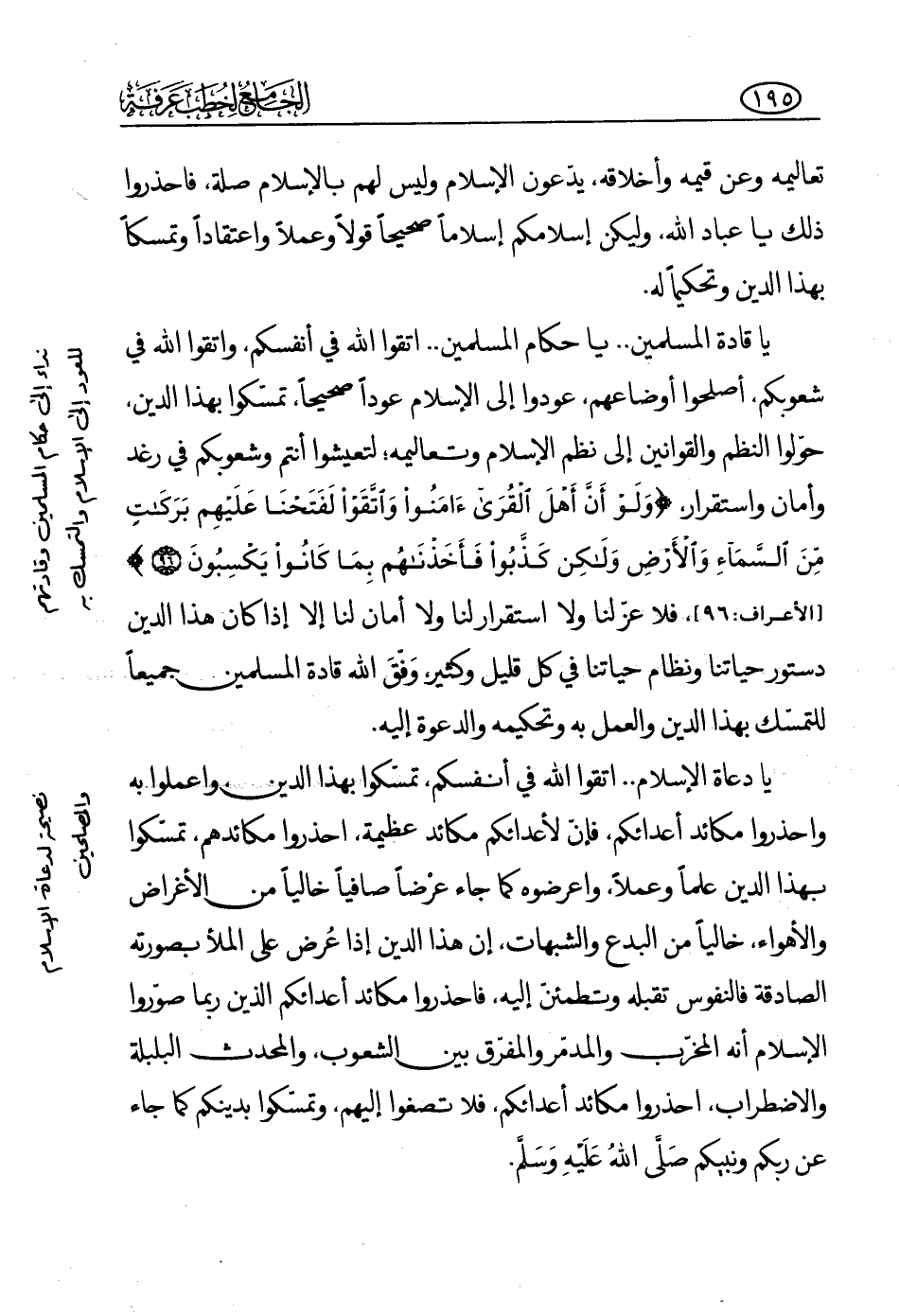 يا قادة الإسلام، يا حكام المسلمين، اتقوا الله في أنفسكم واتقوا الله في شعوبكم، أصلحوا أوضاعهما، عودوا إلى الإسلام عودة صحيحة، تمسكوا بهذا الدين، حولوا النظم والقوانين إلى نظم الإسلام وتعاليمه؛ لتعيشوا أنتم وشعوبكم في رغد وأمان واستقرار {وَلَوْ أَنَّ أَهْلَ الْقُرَى آمَنُوا وَاتَّقَوْا لَفَتَحْنَا عَلَيْهِمْ بَرَكَاتٍ مِنَ السَّمَاءِ وَالْأَرْضِ وَلَكِنْ كَذَّبُوا فَأَخَذْنَاهُمْ بِمَا كَانُوا يَكْسِبُونَ} (¬1) ، فلا عز لنا ولا استقرار لنا ولا أمان لنا إلا إذا كان هذا الدين دستور حياتنا ونظام حياتنا في كل قليل وكثير، وفق الله قادة المسلمين جميعا للتمسك بهذا الدين والعمل به وتحكيمه والدعوة إليه.