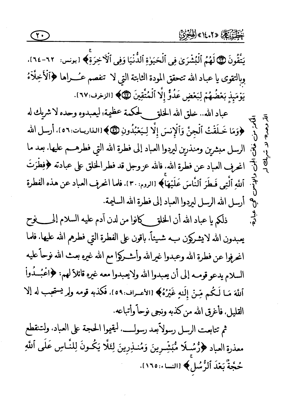 عباد الله، خلق الله الخلق لحكمة عظيمة ليعبدوه وحده لا شريك له {وَمَا خَلَقْتُ الْجِنَّ وَالْإِنْسَ إِلَّا لِيَعْبُدُونِ} (¬2) ، أرسل الله الرسل مبشرين ومنذرين ليردوا العباد إلى فطرة الله التي فطرهم عليها، بعد ما انحرف العباد عن فطرة الله، فالله -عز وجل- قد فطر الخلق على عبادته {فِطْرَةَ اللَّهِ الَّتِي فَطَرَ النَّاسَ عَلَيْهَا} (¬3) ، فلما انحرف العباد عن هذه الفطرة أرسل الله الرسل ليردوا العباد إلى فطرة الله السليمة.