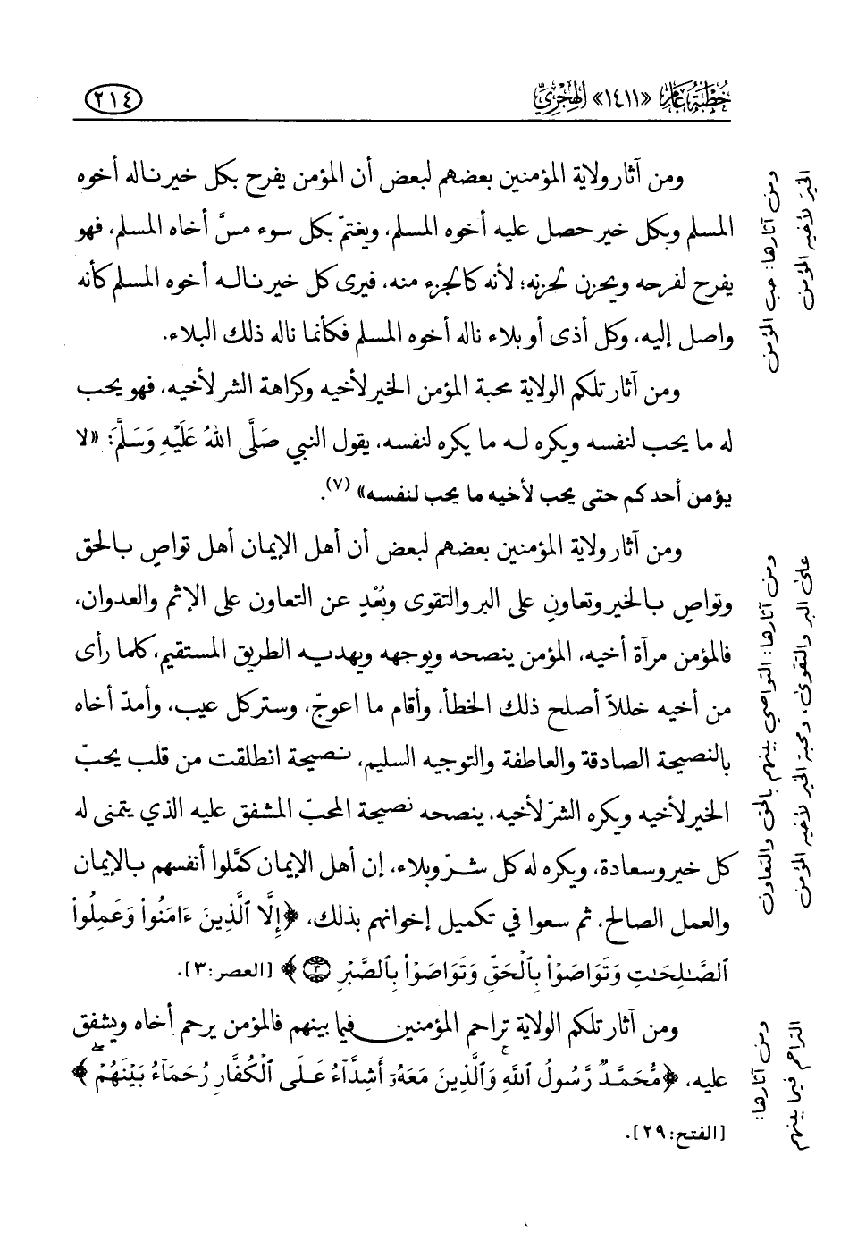 “ ومن آثارها التواصي بينهم بالحق والتعاون على البر والتقوى ومحبة الخير لأخيه المؤمن “