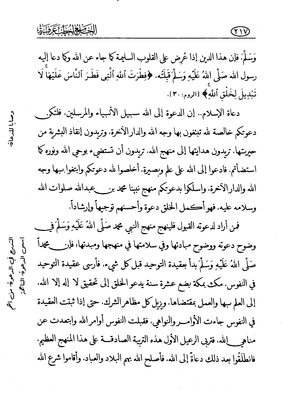 دعاة الإسلام، إن الدعوة إلى الله سبيل الأنبياء والمرسلين، فلتكن دعوتكم خالصة لله، تبتغون بها وجه الله والدار الآخرة، وتريدون إنقاذ البشرية من حيرتها، تريدون هدايتها إلى منهج الله، تريدون أن تستضيء بوحي الله ونوره كما استضأتم، فادعوا إلى الله على علم وبصيرة، أخلصوا لله دعوتكم وابتغوا بها وجه الله والدار الآخرة، واسلكوا بدعوتكم منهج نبينا محمد بن عبد الله، صلوات الله وسلامه عليه، فهو أكمل الخلق دعوة وأحسنهم توجيها وإرشادا.