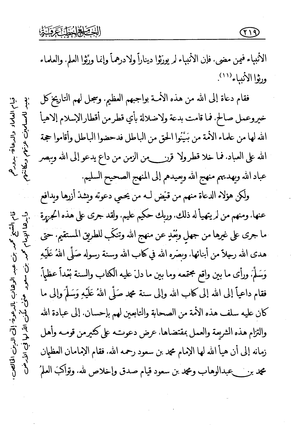 ولكن هؤلاء الدعاة منهم من قيد له من يحمي دعوته ويشد أزره ويدفع عنه، ومنهم من لم يتهيأ له ذلك، وربك حكيم عليم، فلقد جرى على هذه الجزيرة ما جرى على غيرها من جهل وبعد عن منهج الله، وتنكب للطريق المستقيم، حتى هدى الله رجلا من أبنائها فبصره الله في كتاب الله وسنة رسوله -صلى الله عليه وسلم-، ورأى ما بين واقع مجتمعه وما دل عليه الكتاب والسنة بعدا عظيما، فقام داعيا إلى الله، إلى كتاب الله، وإلى سنة محمد -صلى الله عليه وسلم-، وإلى ما كان عليه سلف هذه الأمة من الصحابة والتابعين لهم بإحسان إلى عبادة الله والتزام هذه الشريعة، والعمل بمقتضاها، عرض دعوته على كثير من قومه وأهل زمانه، إلى أن هيأ الله له الإمام محمد بن سعود -رحمه الله-، فقام الإمامان العظيمان: محمد بن عبد الوهاب، ومحمد بن سعود، قيام صدق وإخلاص لله، وتواكب العلم