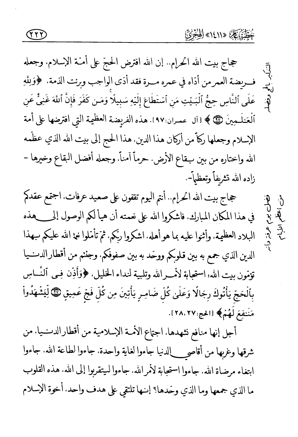 حجاج بيت الله الحرام، أنتم اليوم تقفون على صعيد عرفات، اجتمع عقدكم في هذا المكان المبارك، فاشكروا الله على نعمته أن هيأ لكم الوصول إلى هذه البلاد العظيمة، وأثنوا عليه بما هو أهله، اشكروا ربكم، ثم تأملوا نعمة الله عليكم بهذا الدين الذي جمع به بين قلوبكم، ووحد به بين صفوفكم، وجئتم من أقطار الدنيا تؤمون بيت الله، استجابة لأمر الله، وتلبية لنداء الخليل، {وَأَذِّنْ فِي النَّاسِ بِالْحَجِّ يَأْتُوكَ رِجَالًا وَعَلَى كُلِّ ضَامِرٍ يَأْتِينَ مِنْ كُلِّ فَجٍّ عَمِيقٍ} (¬2) {لِيَشْهَدُوا مَنَافِعَ لَهُمْ} (¬3) .