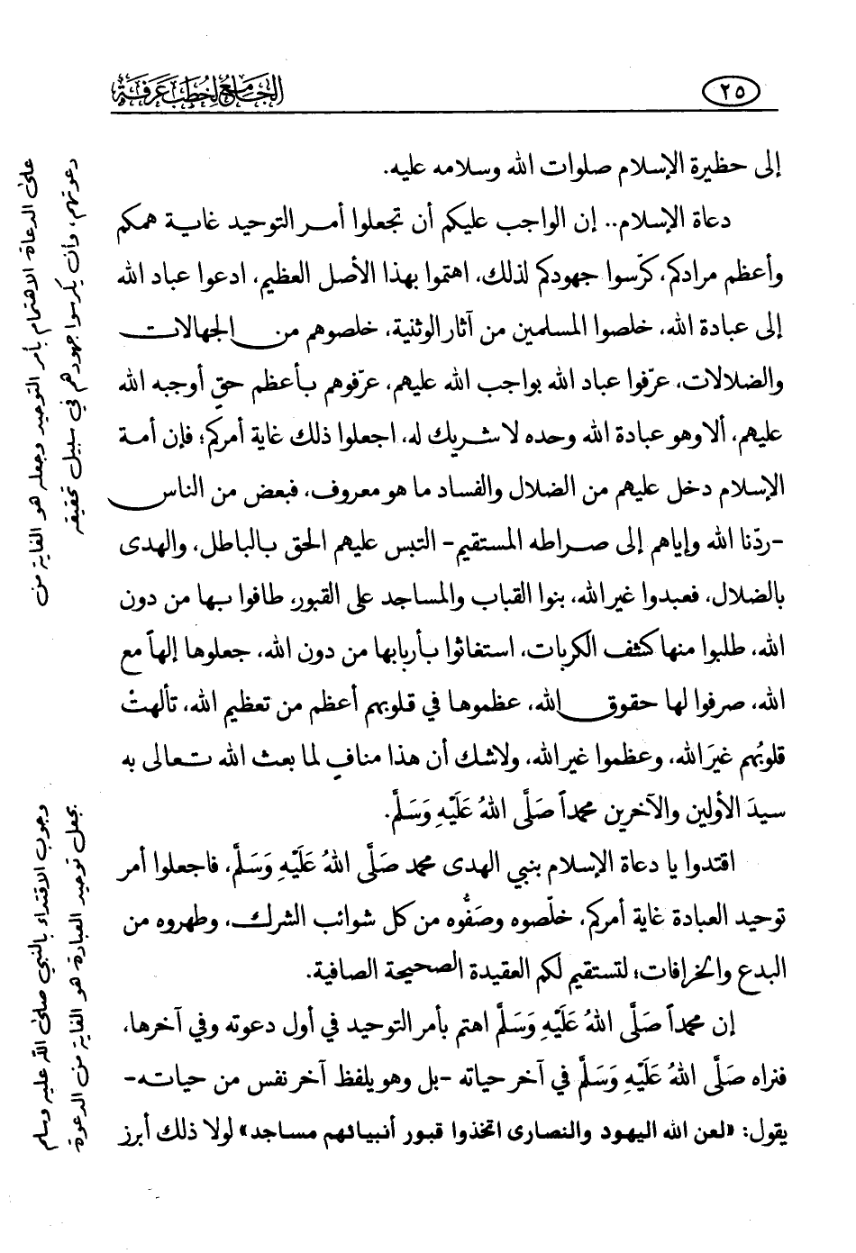 دعاة الإسلام، إن الواجب عليكم أن تجعلوا أمر التوحيد غاية همكم وأعظم مرادكم، كرسوا جهودكم لذلك، اهتموا بهذا الأصل العظيم، ادعوا عباد الله إلى عبادة الله، خلصوا المسلمين من آثار الوثنية، خلصوهم من الجهالات والضلالات، عرفوهم بأعظم حق أوجبه الله عليهم، ألا وهو عبادة الله وحده لا شريك له، اجعلوا ذلك غاية أمركم، فإن أمة الإسلام دخل عليهم من الضلال والفساد ما هو معروف، فبعض من الناس – ردنا الله وإياهم إلى صراطه المستقيم – التبس عليهم الحق بالباطل، والهدى بالضلال، فعبدوا غير الله، بنوا القباب والمساجد على القبور، طافوا بها من دون الله، طلبوا منها كشف الكربات، استغاثوا بأربابها من دون الله، جعلوها إلها مع الله، صرفوا لها حقوق الله، عظموها في قلوبهم أعظم من تعظيم الله، تألهت قلوبهم غير الله، وعظموا غير الله، ولا شك أن هذا مناف لما بعث الله تعالى به سيد الأولين والآخرين محمدا صلى الله عليه وسلم.