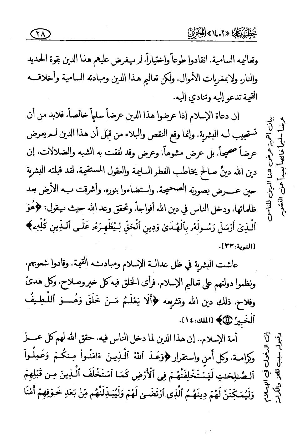 إن دعاة الإسلام إذا عرضوا هذا الدين عرضا سليما خالصا، فلا بد من أن تستجيب له البشرية، وإنما وقع النقص والبلاء من قبل أن هذا الدين لم يعرض عرضا صحيحا، بل عرض مشوها، وعرض وقد لفقت به الشبه والضلالات، إن دين الله دين صالح يخاطب الفطر السليمة والعقول المستقيمة، لقد قبلته البشرية حين عرض بصورته الصحيحة، واستضاءوا بنوره، وأشرقت به الأرض بعد ظلماتها، ودخل الناس في دين الله أفواجا، وتحقق وعد الله حيث يقول: {هُوَ الَّذِي أَرْسَلَ رَسُولَهُ بِالْهُدَى وَدِينِ الْحَقِّ لِيُظْهِرَهُ عَلَى الدِّينِ كُلِّهِ} (¬1) .