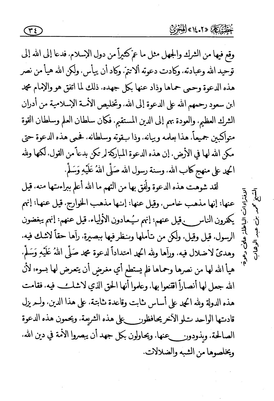 وقع فيها من الشرك والجهل مثل ما عم كثيرا من دول الإسلام، فدعا إلى الله إلى توحيد الله وعبادته، وكادت دعوته ألا تتم، وكاد أن ييأس، ولكن الله هيأ من نصر هذه الدعوة وحمى حماها وذاد عنها بكل جهده، ذلك لما اتفق هو والإمام محمد بن سعود -رحمهم الله- على الدعوة إلى الله، وتخليص الأمة الإسلامية من أدران الشرك العظيم، والعودة بهم إلى الدين المستقيم، فكان سلطان العلم وسلطان القوة متواكبين جميعا، هذا بعلمه وبيانه، وذا بقوته وسلطانه، فحمى هذه الدعوة حتى مكن الله لها في الأرض، إن هذه الدعوة المباركة لم تكن بدعا من القول، لكنها ولله الحمد على منهج كتاب الله، وسنة رسول الله صلى الله عليه وسلم.