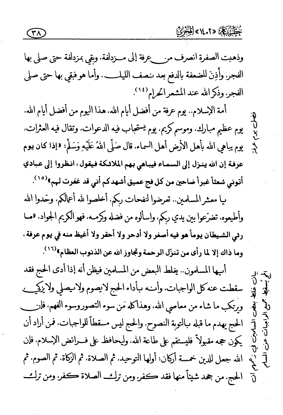 أيها المسلمون، يغلط البعض من المسلمين فيظن أنه إذا أدى الحج فقد سقطت عنه كل الواجبات، وأنه بأداء الحج لا يصوم ولا يصلي ولا يزكي ويرتكب ما شاء من معاصي الله، وهذا كله من سوء التصور وسوء الفهم، فإن الحج يهدم ما قبله بالتوبة النصوح، والحج ليس مسقطا للواجبات، فمن أراد أن يكون حجه مقبولا فليستقم على طاعة الله، وليحافظ على فرائض الإسلام، فإن الله جعل للدين خمسة أركان: أولها التوحيد، ثم الصلاة، ثم الزكاة، ثم الصوم، ثم الحج، من جحد شيئا منها فقد كفر، ومن ترك الصلاة كفر، ومن ترك