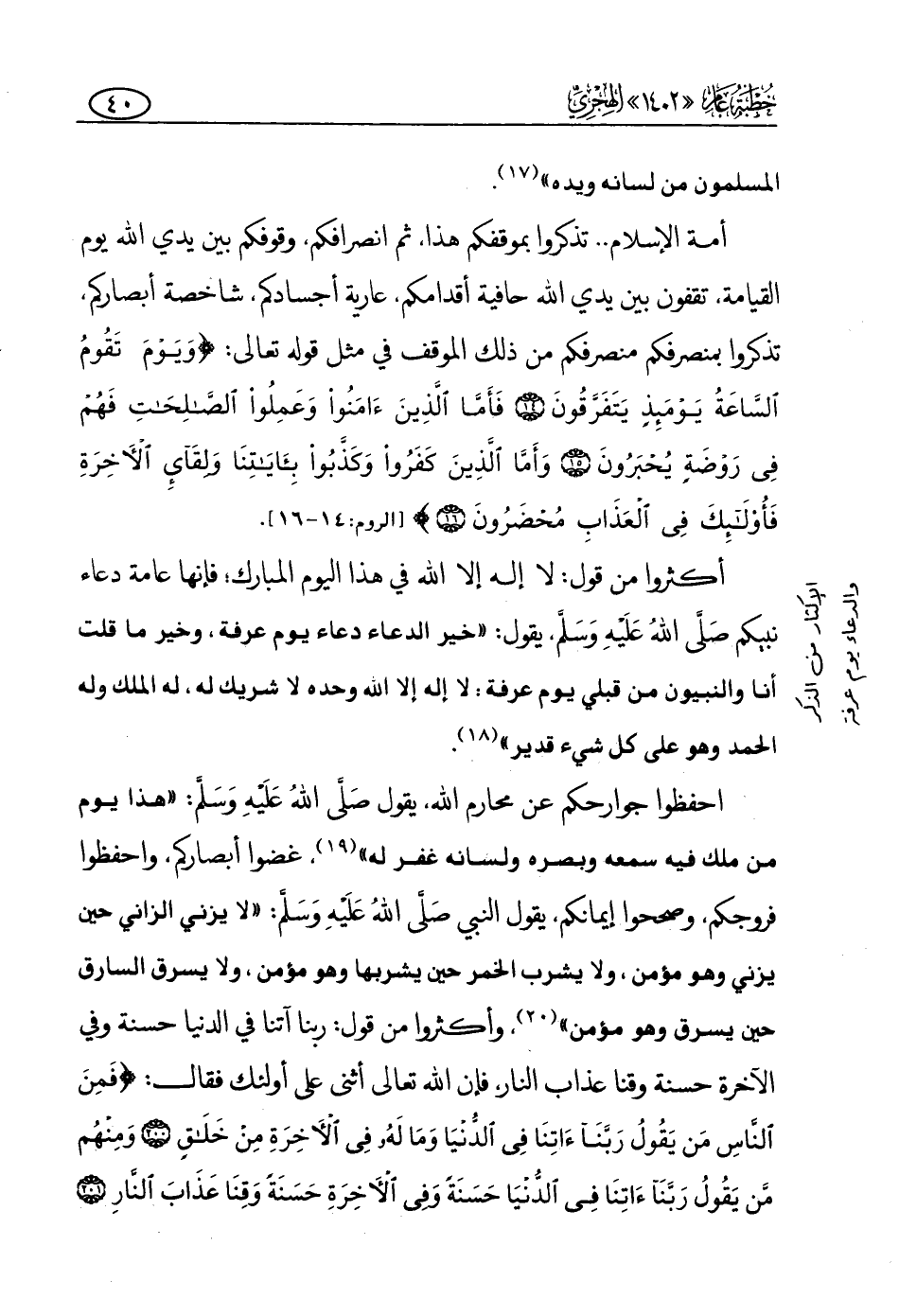 احفظوا جوارحكم عن محارم الله، يقول -صلى الله عليه وسلم-: «هذا يوم من ملك فيه سمعه وبصره ولسانه غفر له (¬5) » غضوا أبصاركم، واحفظوا فروجكم، وصححوا إيمانكم، يقول النبي -صلى الله عليه وسلم-: «لا يزني الزاني حين يزني وهو مؤمن، ولا يشرب الخمر حين يشربها وهو مؤمن، ولا يسرق السارق حين يسرق وهو مؤمن (¬6) » وأكثروا من قول: ربنا آتنا في الدنيا حسنة وفي الآخرة حسنة وقنا عذاب النار؛ فإن الله تعالى أثنى على أولئك فقال: {فَمِنَ النَّاسِ مَنْ يَقُولُ رَبَّنَا آتِنَا فِي الدُّنْيَا وَمَا لَهُ فِي الْآخِرَةِ مِنْ خَلَاقٍ} (¬7) {وَمِنْهُمْ مَنْ يَقُولُ رَبَّنَا آتِنَا فِي الدُّنْيَا حَسَنَةً وَفِي الْآخِرَةِ حَسَنَةً وَقِنَا عَذَابَ النَّارِ} (¬8) {أُولَئِكَ لَهُمْ نَصِيبٌ مِمَّا كَسَبُوا وَاللَّهُ سَرِيعُ الْحِسَابِ} (¬9) .