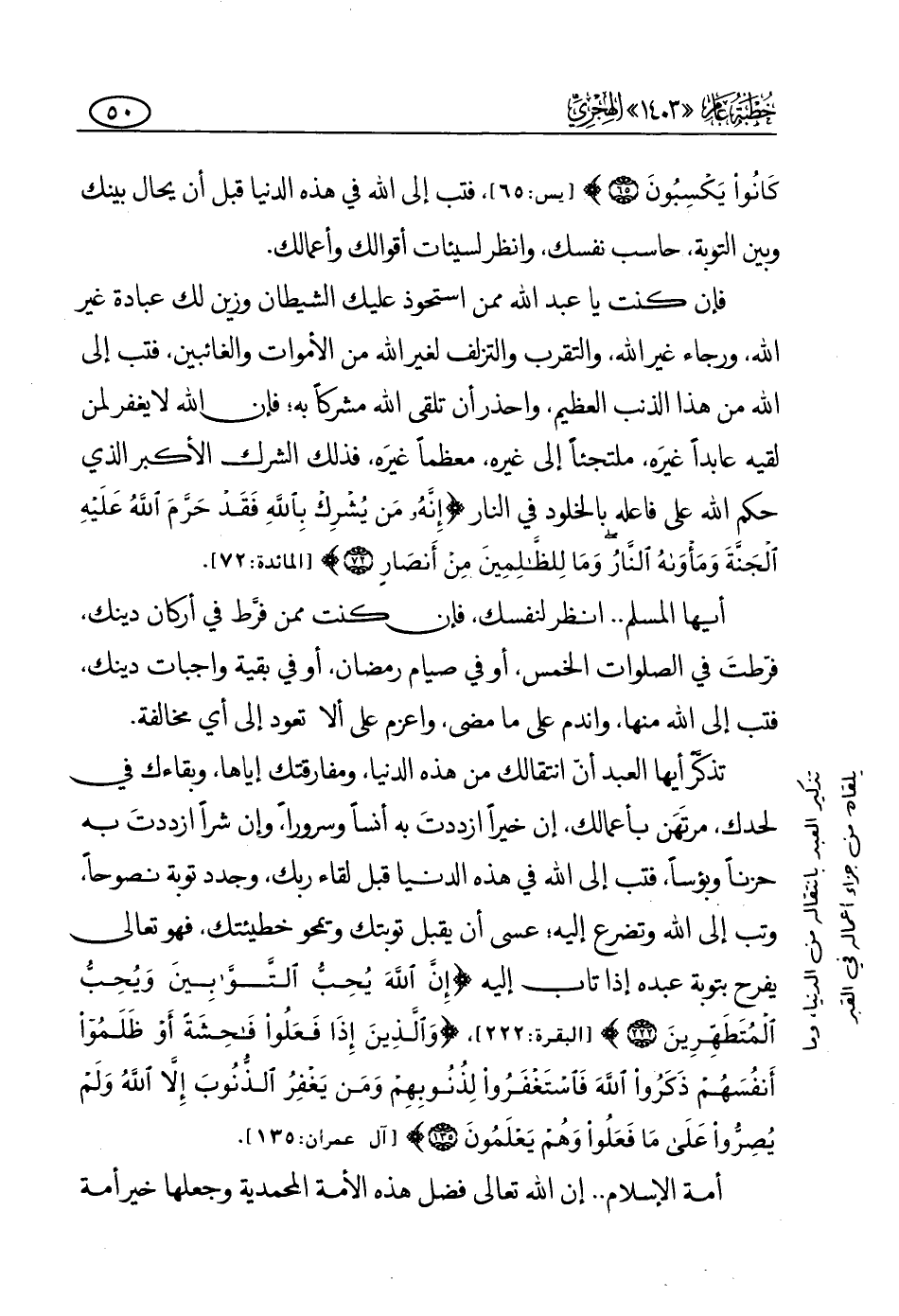 أيها المسلم، انظر لنفسك فإن كنت ممن فرطت في أركان دينك، فرطت في الصلوات الخمس، أو في صيام رمضان، أو في بقية واجبات دينك، فتب إلى الله منها، واندم على ما مضى، واعزم على ألا تعود إلى أي مخالفة.