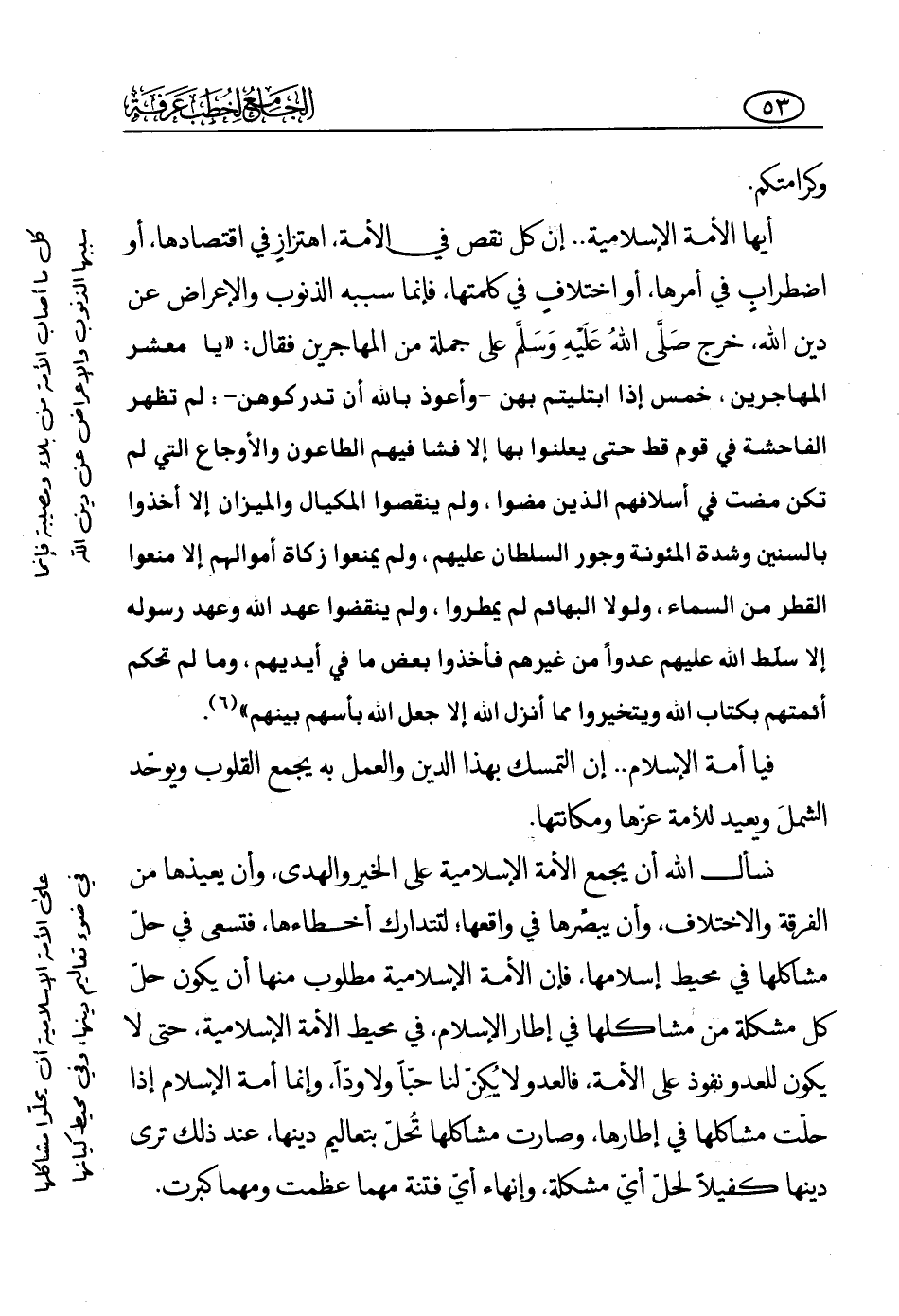 أيها الأمة الإسلامية، إن كل نقص في الأمة، اهتزاز في اقتصادها، أو اضطراب في أمرها، أو اختلاف في كلمتها، فإنما سببه الذنوب والإعراض عن دين الله، خرج -صلى الله عليه وسلم- على جملة من المهاجرين فقال: «يا معشر المهاجرين، خمس إذا ابتليتم بهن -وأعوذ بالله أن تدركوهن -: لم تظهر الفاحشة في قوم قط حتى يعلنوا بها إلا فشا فيهم الطاعون والأوجاع التي لم تكن مضت في أسلافهم الذين مضوا، ولم ينقصوا المكيال والميزان إلا أخذوا بالسنين وشدة المئونة وجور السلطان عليهم، ولم يمنعوا زكاة أموالهم إلا منعوا القطر من السماء، ولولا البهائم لم يمطروا، ولم ينقضوا عهد الله وعهد رسوله إلا سلط الله عليهم عدوا من غيرهم فأخذوا بعض ما في أيديهم، وما لم تحكم أئمتهم بكتاب الله ويتخيروا مما أنزل الله إلا جعل الله بأسهم بينهم (¬1) »