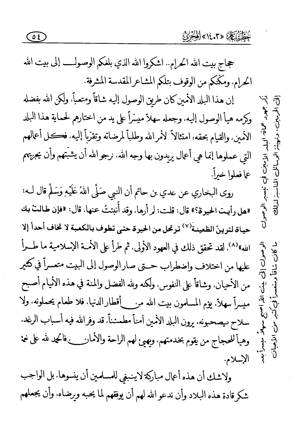 روى البخاري عن عدي بن حاتم أن النبي -صلى الله عليه وسلم- قال له: «هل رأيت الحيرة؟ " قال: قلت: لم أرها، وقد أنبئت عنها، قال: " فإن طالت بك حياة لترين الظعينة (¬2) » ، لقد تحقق ذلك في العهود الأولى، ثم طرأ على الأمة الإسلامية ما طرأ عليها من اختلاف واضطراب حتى صار الوصول إلى البيت متعسرا في كثير من الأحيان، وشاقا على النفوس، ولكنه -ولله الفضل والمنة- في هذه الأيام أصبح ميسرا سهلا، يؤم المسلمون بيت الله من أقطار الدنيا، فلا طعام يحملونه، ولا سلاح يصحبونه، يرون البلد الأمين آمنا مطمئنا، قد وفر الله فيه أسباب الرغد، وهيأ للحجاج من يقوم بخدمتهم، ويهيئ لهم الراحة والأمان، فالحمد لله على نعمة الإسلام.