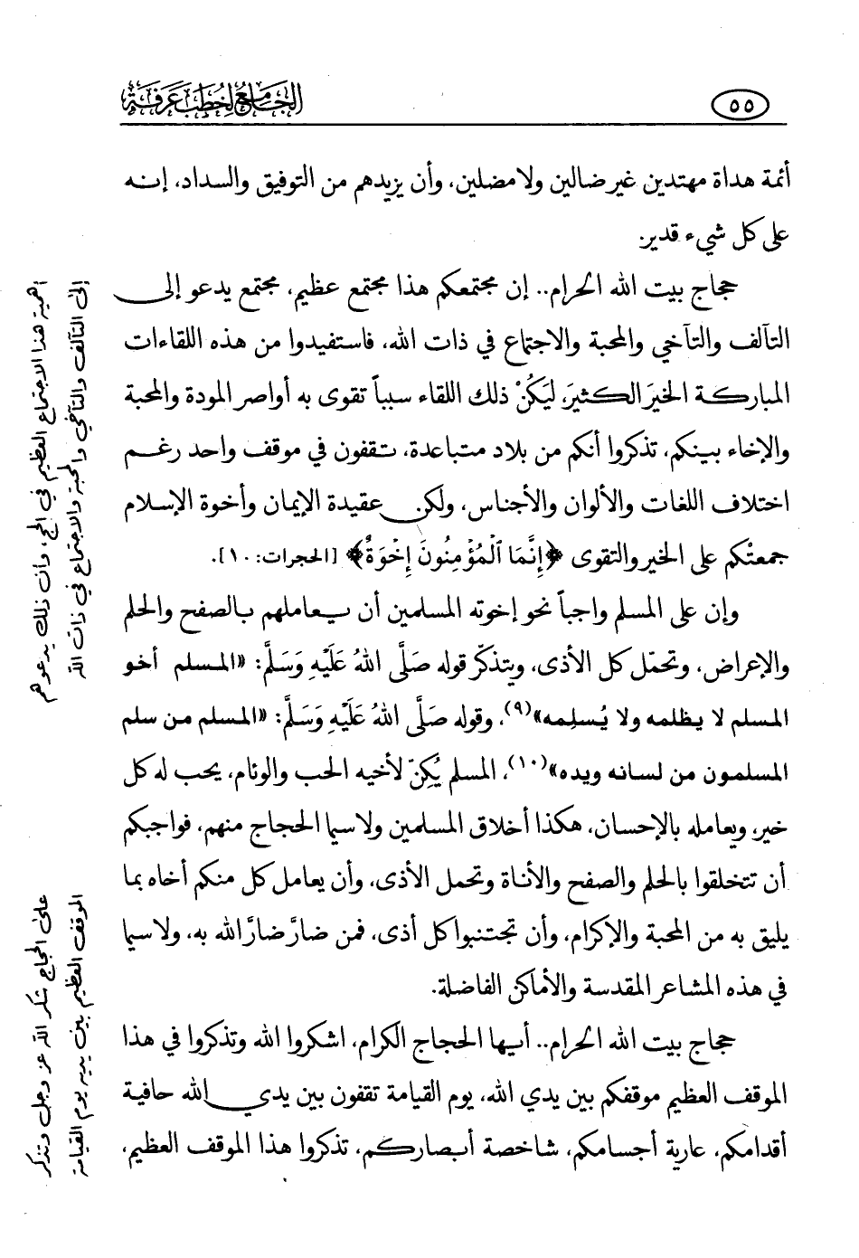 حجاج بيت الله الحرام، إن مجتمعكم هذا مجتمع عظيم، مجتمع يدعو إلى التآلف والتآخي والمحبة والاجتماع في ذات الله، فاستفيدوا من هذه اللقاءات المباركة الخير الكثير، ليكن ذلك اللقاء سببا تقوى به أواصر المودة والمحبة والإخاء بينكم، تذكروا أنكم من بلاد متباعدة، تقفون في موقف واحد رغم اختلاف اللغات والألوان والأجناس، ولكن عقيدة الإيمان وأخوة الإسلام جمعتكم على الخير والتقوى {إِنَّمَا الْمُؤْمِنُونَ إِخْوَةٌ} (¬1) .