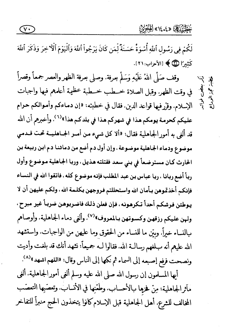 وقف -صلى الله عليه وسلم- بعرفة، وصلى بعرفة الظهر والعصر جمعا وقصرا في وقت الظهر، وقبل الصلاة خطب خطبة عظيمة أعلمهم فيها واجبات الإسلام، وقرر فيها قواعد الدين، فقال في خطبته: «إن دماءكم وأموالكم عليكم حرام كحرمة يومكم هذا، في شهركم هذا، في بلدكم هذا (¬1) » وأخبرهم أن الله قد ألغى به أمور الجاهلية فقال: «ألا إن كل شيء من أمر الجاهلية تحت قدمي موضوع ودماء الجاهلية موضوعة، وأول دم أضعه دماؤنا، دم ابن ربيعة بن الحارث، كان مسترضعا في بني سعد فقتلته هذيل، وربا الجاهلية موضوع، وأول ربا أضعه ربانا، ربا عباس بن عبد المطلب، فإنه موضوع كله، فاتقوا الله في النساء؛ فإنكم أخذتموهن بأمانة الله واستحللتم فروجهن بكلمة الله، ولكم عليهن أن لا يوطئن فرشكم أحدا تكرهونه، فإن فعلن فاضربوهن ضربا غير مبرح، ولهن عليكم رزقهن وكسوتهن بالمعروف (¬2) » وألغى دماء الجاهلية، وأوصاهم بالنساء خيرا، وبين ما للنساء من الحقوق، وما عليهن من الواجبات، واستشهد الله عليهم أنه بلغهم رسالة الله، فقالوا له جميعا: نشهد أنك قد بلغت وأديت ونصحت، فرفع إصبعه إلى السماء ثم نكتها إلى الناس وقال: «اللهم اشهد (¬3) »