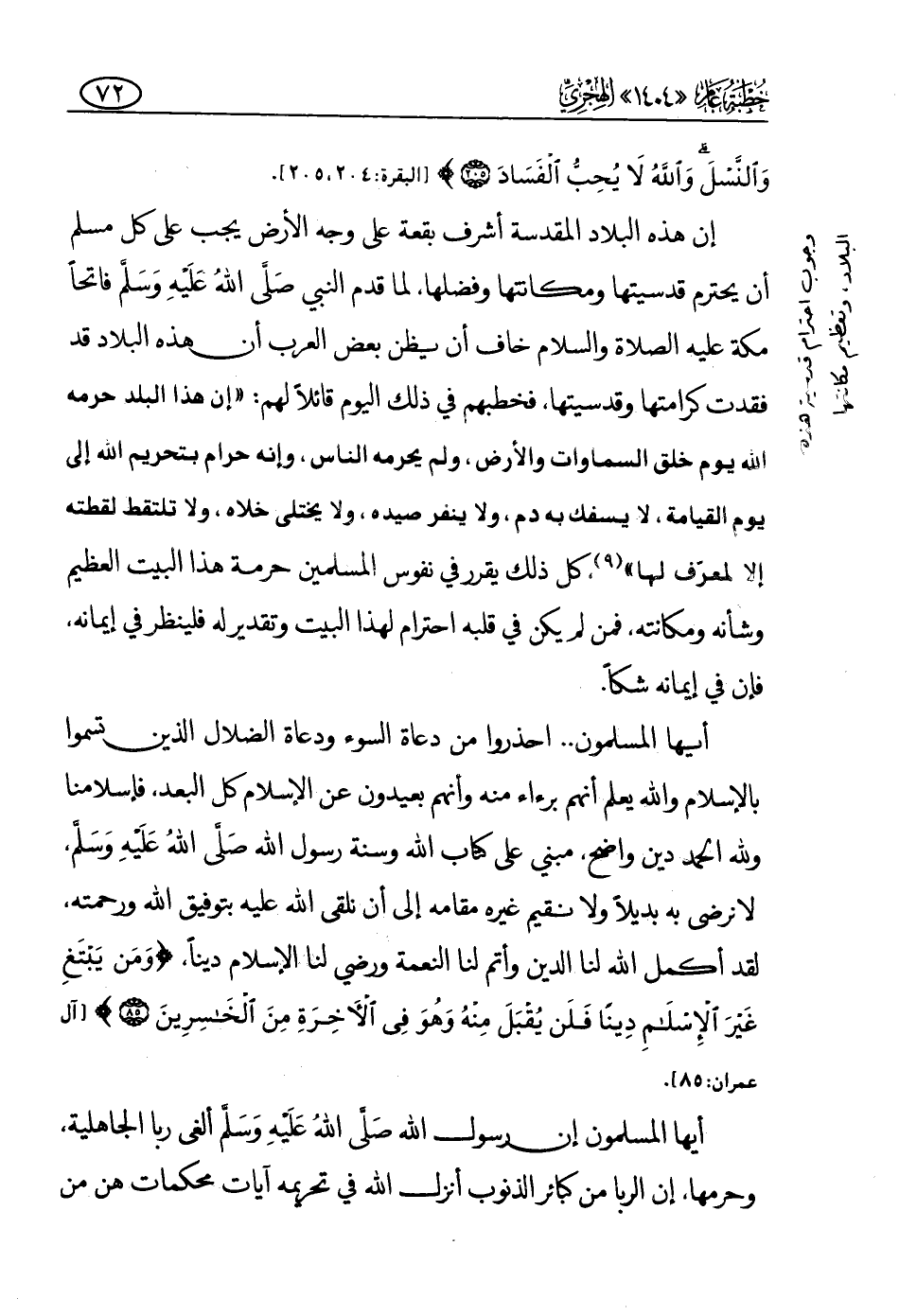 إن هذه البلاد المقدسة أشرف بقعة على وجه الأرض، يجب على كل مسلم أن يحترم قدسيتها ومكانتها وفضلها، لما قدم النبي -صلى الله عليه وسلم- فاتحا مكة -عليه الصلاة والسلام- خاف أن يظن بعض العرب أن هذه البلاد قد فقدت كرامتها وقدسيتها، فخطبهم في ذلك اليوم قائلا لهم: «إن هذا البلد حرمه الله يوم خلق السماوات والأرض، ولم يحرمه الناس، وإنه حرام بتحريم الله إلى يوم القيامة، لا يسفك به دم، ولا ينفر صيده، ولا يختلى خلاه، ولا تلتقط لقطته إلا لمعرف لها (¬1) » كل ذلك يقرر في نفوس المسلمين حرمة هذا البيت العظيم وشأنه ومكانته، فمن لم يكن في قلبه احتراما لهذا البيت وتقديرا له، فلينظر في إيمانه، فإن في إيمانه شكا.