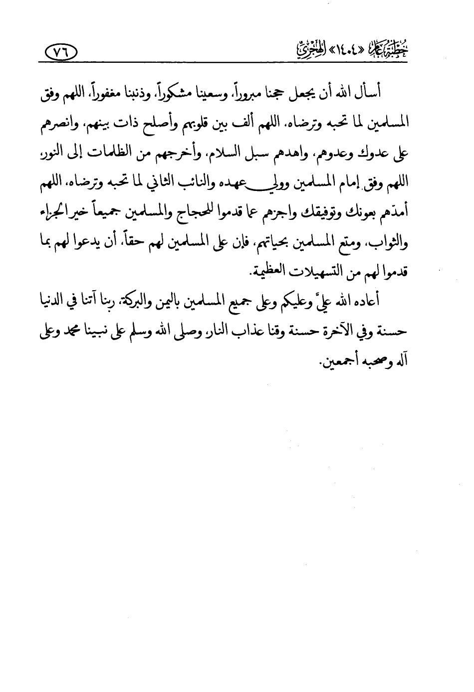 أسأل الله أن يجعل حجنا مبرورا، وسعينا مشكورا، وذنبنا مغفورا، اللهم وفق المسلمين لما تحبه وترضاه، اللهم ألف بين قلوبهم وأصلح ذات بينهم، وانصرهم على عدوك وعدوهم، واهدهم سبل السلام، وأخرجهم من الظلمات إلى النور، اللهم وفق إمام المسلمين وولي عهده والنائب الثاني لما تحبه وترضاه، اللهم أمدهم بعونك وتوفيقك، واجزهم عما قدموا الحجاج والمسلمين جمعيا خير الجزاء والثواب، ومتع المسلمين بحياتهم، فإن على المسلمين لهم حقا أن يدعوا لهم بما قدموا لهم من التسهيلات العظيمة.