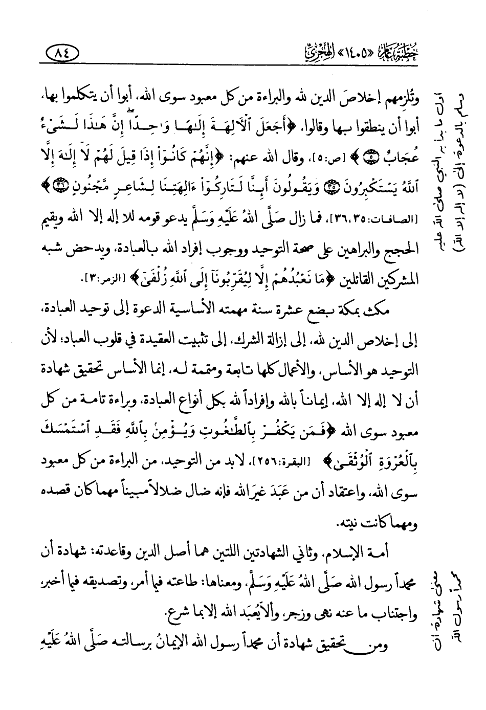 وتلزمهم إخلاص الدين لله والبراءة من كل معبود سوى الله، أبوا أن يتكلموا بها، أبوا أن ينطقوا بها وقالوا: {أَجَعَلَ الْآلِهَةَ إِلَهًا وَاحِدًا إِنَّ هَذَا لَشَيْءٌ عُجَابٌ} (¬1) ، وقال الله عنهم: {إِنَّهُمْ كَانُوا إِذَا قِيلَ لَهُمْ لَا إِلَهَ إِلَّا اللَّهُ يَسْتَكْبِرُونَ} (¬2) {وَيَقُولُونَ أَئِنَّا لَتَارِكُو آلِهَتِنَا لِشَاعِرٍ مَجْنُونٍ} (¬3) ، فما زال -صلى الله عليه وسلم- يدعو قومه للا إله إلا الله، ويقيم الحجج والبراهين على صحة التوحيد ووجوب إفراد الله بالعبادة، ويدحض شبه المشركين القائلين: {مَا نَعْبُدُهُمْ إِلَّا لِيُقَرِّبُونَا إِلَى اللَّهِ زُلْفَى} (¬4) .