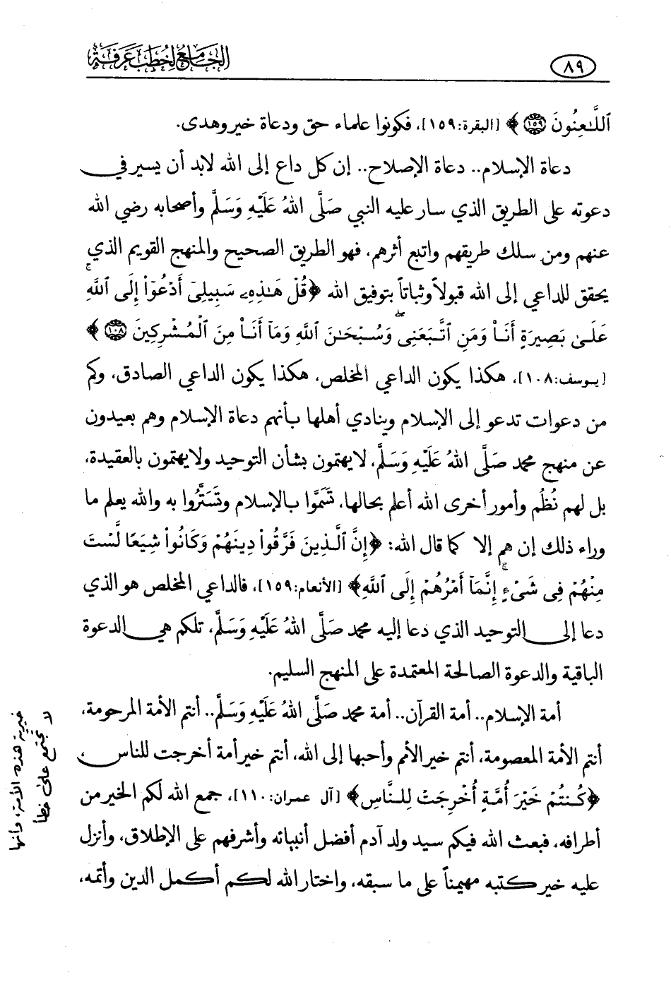 دعاة الإسلام، دعاة الإصلاح، إن كل داع إلى الله لا بد أن يسير في دعوته على الطريق الذي سار عليه النبي -صلى الله عليه وسلم- وأصحابه -رضي الله عنه-، ومن سلك طريقهم واتبع أثرهم، فهو الطريق الصحيح والمنهج القويم الذي يحقق للداعي إلى الله قبولا وثباتا بتوفيق الله {قُلْ هَذِهِ سَبِيلِي أَدْعُو إِلَى اللَّهِ عَلَى بَصِيرَةٍ أَنَا وَمَنِ اتَّبَعَنِي وَسُبْحَانَ اللَّهِ وَمَا أَنَا مِنَ الْمُشْرِكِينَ} (¬1) ، هكذا يكون الداعي المخلص، هكذا يكون الداعي الصادق، وكم من دعوات تدعو إلى الإسلام وينادي أهلها بأنهم دعاة الإسلام وهم بعيدون عن منهج محمد -صلى الله عليه وسلم-، لا يهتمون بشأن التوحيد ولا يهتمون بالعقيدة، بل لهم نظم وأمور أخرى الله أعلم بحالها، تسموا بالإسلام وتستروا به، والله يعلم ما وراء ذلك، إن هم إلا كما قال الله: {إِنَّ الَّذِينَ فَرَّقُوا دِينَهُمْ وَكَانُوا شِيَعًا لَسْتَ مِنْهُمْ فِي شَيْءٍ إِنَّمَا أَمْرُهُمْ إِلَى اللَّهِ} (¬2) ، فالداعي المخلص هو الذي دعا إلى التوحيد الذي دعا إليه محمد -صلى الله عليه وسلم-، تلكم هي الدعوة الباقية والدعوة الصالحة المعتمدة على المنهج السليم.
