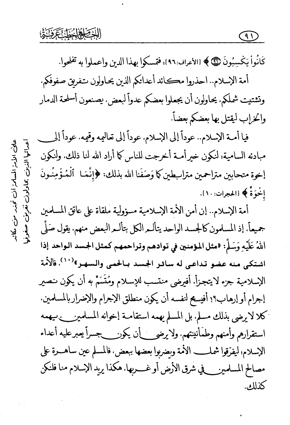 أمة الإسلام، احذروا مكائد أعدائكم الذين يحاولون تفريق صفوفكم وتشتيت شملكم، يحاولون أن يجعلوا بعضكم عدوا لبعض، يصنعون أسلحة الدمار والخراب ليقتل به بعضكم بعضا.