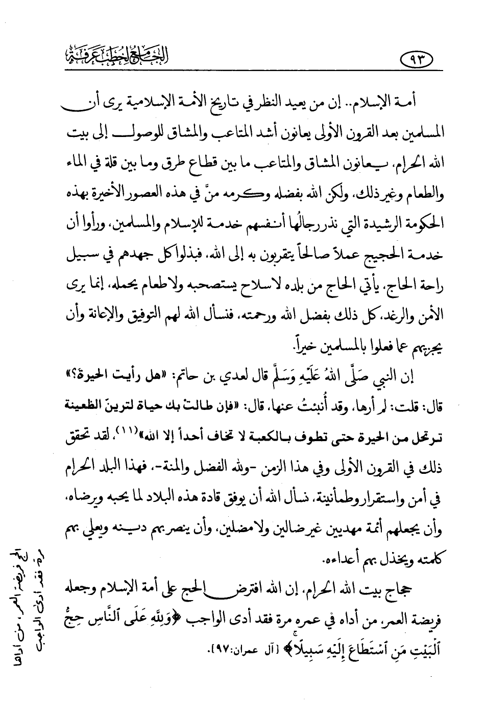 أمة الإسلام، إن من يعيد النظر في تاريخ الأمة الإسلامية يرى أن المسلمين بعد القرون الأولى يعانون أشد المتاعب والمشاق للوصول إلى بيت الله الحرام، يعانون المشاق والمتاعب ما بين قطاع طرق، وما بين قلة في الماء والطعام وغير ذلك، ولكن الله بفضله وكرمه من في هذه العصور الأخيرة بهذه الحكومة الرشيدة التي نذر رجالها أنفسهم خدمة للإسلام والمسلمين، ورأوا أن خدمة الحجيج عملا صالحا يتقربون به إلى الله، بذلوا كل جهدهم في سبيل راحة الحاج، يأتي الحاج من بلده لا سلاح يصطحبه ولا طعام يحمله، إنما يرى الأمن والرغد، كل ذلك بفضل الله ورحمته، فنسأل الله لهم التوفيق والإعانة، وأن يجازيهم عما فعلوا بالمسلمين خيرا.