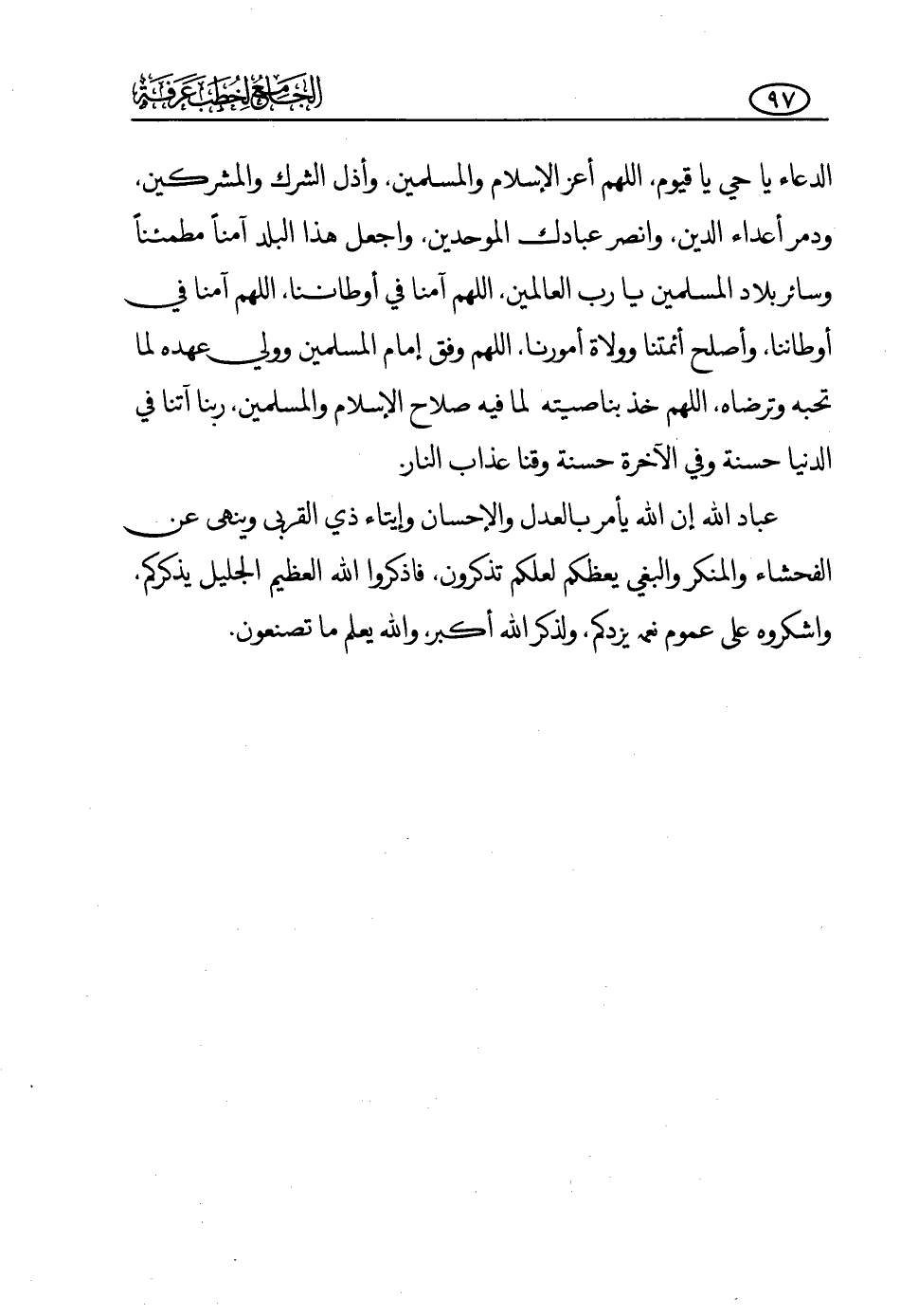 الدعاء، يا حي يا قيوم، اللهم أعز الإسلام والمسلمين، وأذل الشرك والمشركين، ودمر أعداء الدين، وانصر عبادك الموحدين، واجعل هذا البلد آمنا مطمئنا وسائر بلاد المسلمين، يا رب العالمين، اللهم أمنا في أوطاننا، اللهم أمنا في أوطاننا، وأصلح أئمتنا وولاة أمورنا، اللهم وفق إمام المسلمين وولي عهده لما تحبه وترضاه، اللهم خذ بناصيته لما فيه صلاح الإسلام والمسلمين، ربنا آتنا في الدنيا حسنة، وفي الآخرة حسنة، وقنا عذاب النار.