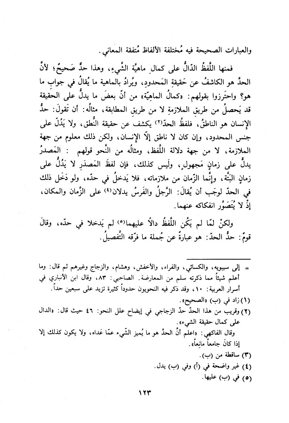 فمنها اللَّفظُ على كمالِ ماهيَّة الشَّيءِ، وهذا حدُّ صَحيحُ؛ لأنَّ الحدَّ هو الكاشفُ عن حَقيقةِ المَحدودِ، ويُرادُ بالماهية ما يُقالُ في جوابِ ما هو؟ واحتَرزوا بقولهم: ((كمالُ الماهِيّة)) من أنّ بعضَ ما يدلُّ على الحقيقة قد يَحصلُ من طريقِ الملازمةِ لا من طريقِ المطابقة، مثالُه: أن تَقولَ: حدُّ الإنسان هو الناطقُ فلفظُ الحدّ يكشف عن حقيقة النُّطق، ولا يَدُلّ على جنس المحدود، وإن كان لا ناطق إلاّ الإنسان، ولكن ذلك معلوم من جهة الملازمة، لا من جهة دلالة اللَّفظ، ومثالُه من النَّحو قولهم: المَصدرُ يدلُّ على زمانٍ مَجهولٍ، ولَيس كذلك، فإن لفظَ المَصدَرِ لا يَدُلُّ على زمانٍ البَتَّة وإنَّما الزّمان من ملازماته، فلا يَدخلُ في حدّه، ولو دَخَل ذلك في الحدّ لوجَب أن يُقالَ: الرَّجل والفَرسُ يدلان على الزَّمان والمكان، إذْ يُتَصَوَّر انفكاكه عنهما.