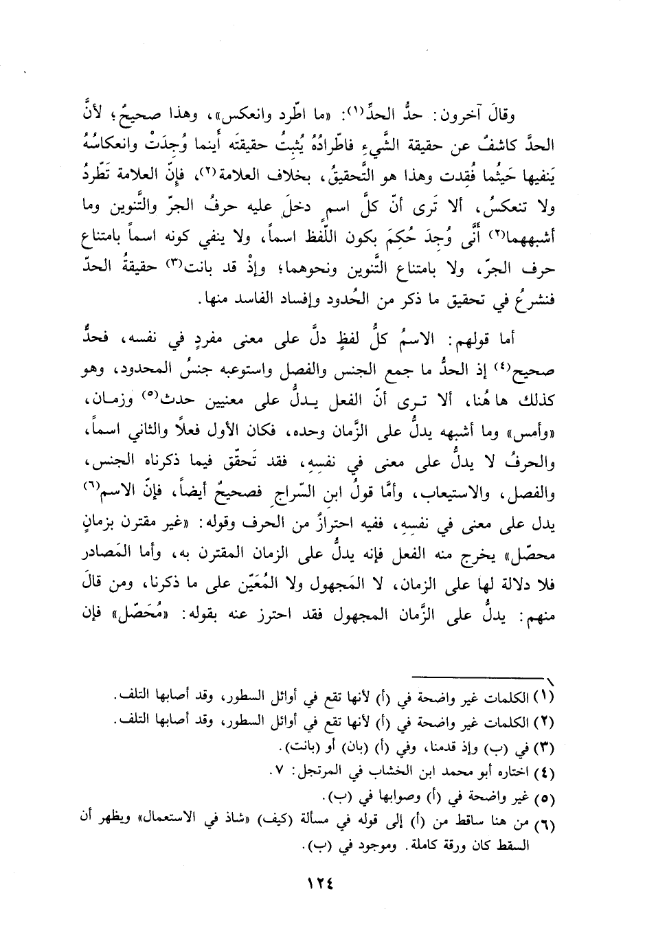 وقالَ آخرون: حدُّ الحدِّ: ((ما اطّرد وانعكس))، وهذا صحيحُ؛ لأنَّ الحدَّ كاشفُ عن حقيقة الشَّيءِ فاطّرادُهُ يُثبِتُ حقيقتَه أينما وُجِدَتْ وانعكاسُهُ يَنفيها حَيثُما فُقِدت وهذا هو التَّحقيقُ، بخلاف العلامة، فإِنّ العلامة تَطّردُ ولا تنعكسُ، ألا تَرى أنّ كلَّ اسمٍ دخلَ عليه حرفُ الجرّ والتَّنوين وما أشبههما أَنَّى وُجِدَ حُكِمَ بكون اللّفظ اسمًا، ولا ينفي كونه اسمًا بامتناع حرف الجرّ، ولا بامتناع التَّنوين ونحوهما؛ وإذْ قد بانت حقيقةُ الحدّ فنشرعُ في تحقيق ما ذكر من الحُدود وإفساد الفاسد منها.