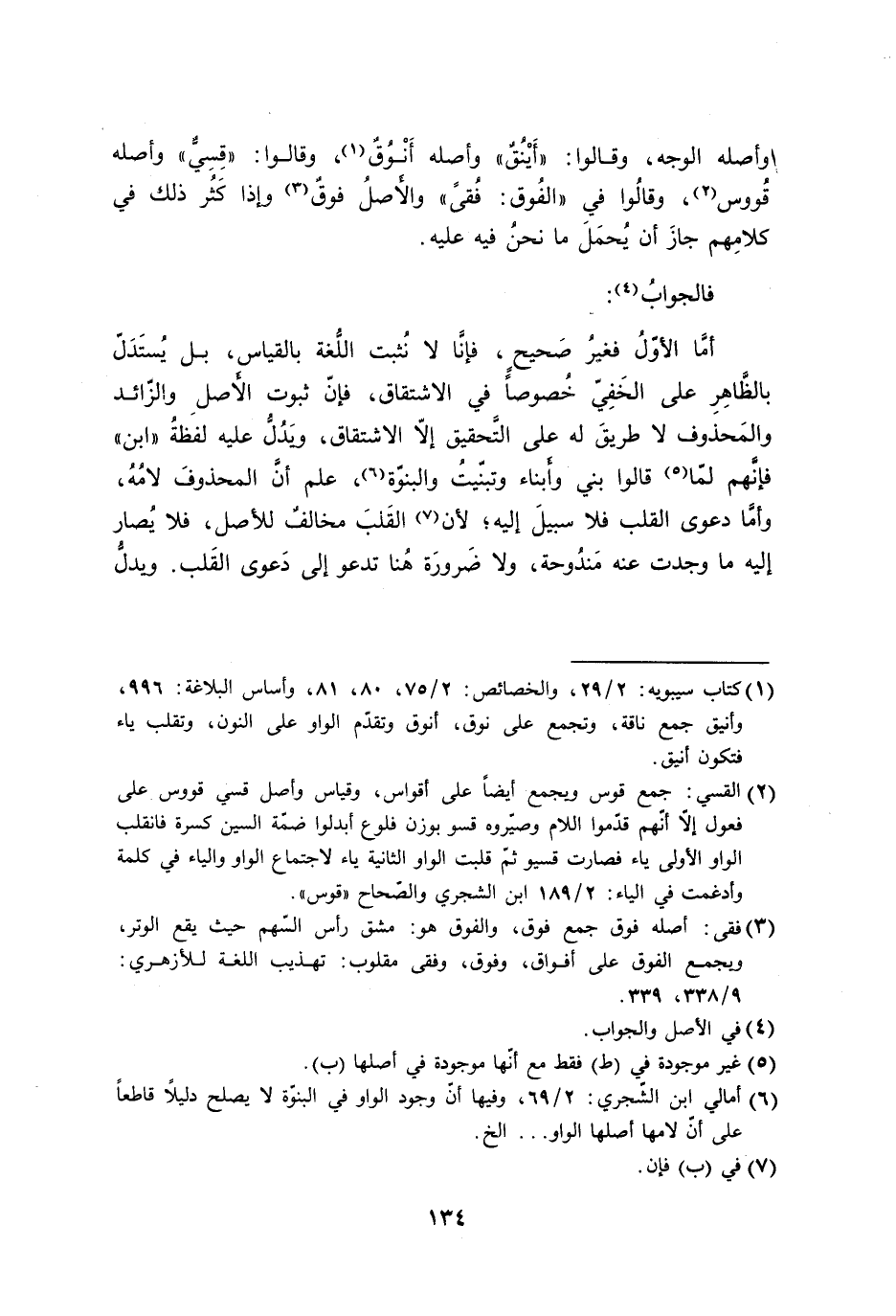 وأصله الوجه، وقالوا: ((أَيْنُقُ)) وأصله أَنْوُقُ، وقالوا: ((قِسِيُّ)) وأصله قُووس، وقالُوا في ((الفُوق: فُقيً)) والأَصلُ فوقُ وإذا كَثُر ذلك في كلامِهم جازَ أن يُحمَلَ ما نحنُ فيه عليه.