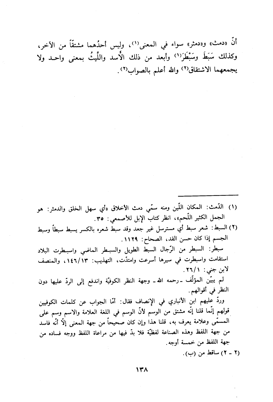 أنّ ((دمث)) و ((دمثر)) سواء في معنى، وليس أحدُهما مشتقّاً من الآخر، وكذلك سَبَطَ وسَبْطَرَ وأبعد من ذلك الأَسد واللَّيثُ بمعنى واحد ولا يجمعهما الاشتقاق والله أعلم بالصواب.