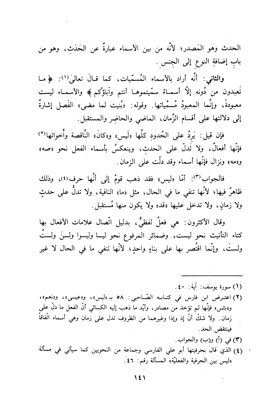 فإن قيل: يَرِدُ على الحُدودِ كلِّها ((لَيس)) و ((كانَ)) النَّاقصة وأَخواتها فإنّها أفعالُ، ولا تَدلّ على الحدثِ، وينعكسُ بأسماء الفعل نحو ((صه)) و ((مه)) ونزال فإنّها وقد دلّت على الزمان.