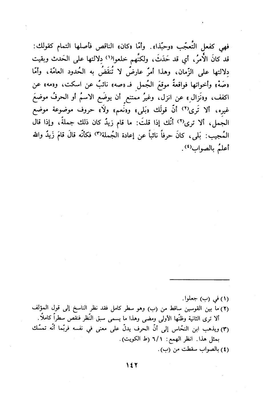 فهي كفعل التَّعجّب ((وحبّذا)). وأمّا ((كان)) الناقص فأصلها التمام كقولك: قد كانَ الأَمرُ، أي قد حَدَثَ، ولكنَّهم خلعوا دِلالتها على الحَدث وبقيت دِلالتها على الزّمان، وهذا أمرُ عارضُ لا تُنقَضُ به الحُدود العامّة، وأمّا ((صَهْ)) وأخواتها فواقعةُ موقعَ الجُملِ ف ((صه)) نائبُ عن اسكت، و ((مه)) عن اكفف، و ((نَزالِ)) عن انزل، وغيرُ ممتنعٍ أن يوضَع الاسمُ أو الحرفُ موضعَ غيرِه، ألا تَرى أنّ قولَك ((بَلى)) و ((نَعم)) و ((لاَ)) حروف موضوعة موضع الجمل، ألا ترى أنّك إذا قلتَ: ما قام زيدُ كان ذلك جملةً، وإذا قال المُجيب: بَلى، كانَ حرفًا نائبًا عن إعادة الجُملة فكأنّه قالَ قامَ زَيدُ والله أعلمُ بالصواب.